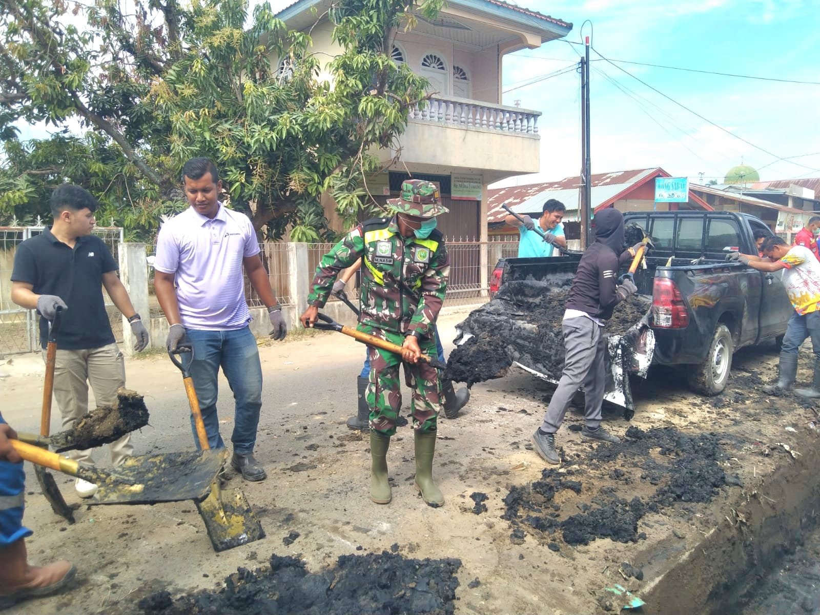 Lhokseumawe – Serda Muhammad Nasir, Babinsa Desa Hagu Teungoh dari Koramil 16/Banda Sakti, melaksanakan kegiatan gotong royong bersama masyarakat dan karyawan PT Pertamina Patra Niaga di sepanjang Jalan Darussalam, Gampong Hagu Teungoh, Kecamatan Banda Sakti, Kota Lhokseumawe pada Jumat, 6 Februari 2026.