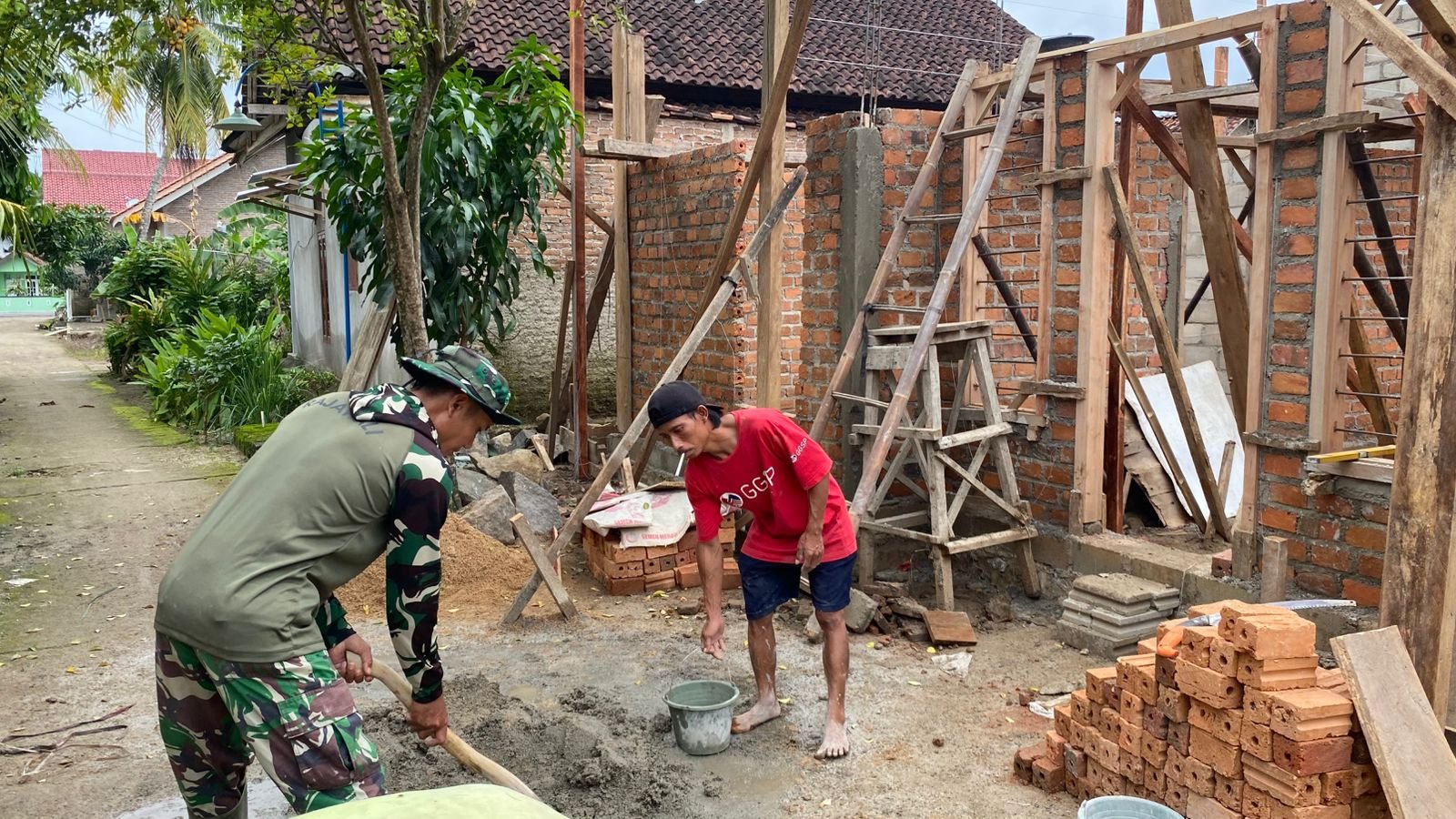 Pesawaran — Program TNI Manunggal Membangun Desa (TMMD) yang dilaksanakan oleh Kodim 0421/Lampung Selatan terus menunjukkan kemajuan yang signifikan di Desa Tanjung Rejo, Kecamatan Way Khilau, Kabupaten Pesawaran. Saat ini, proses rehabilitasi Rumah Tidak Layak Huni (RTLH) milik Ibu Siti Hamdiah telah mencapai tahap pemasangan batu bata serta kusen pintu dan jendela.