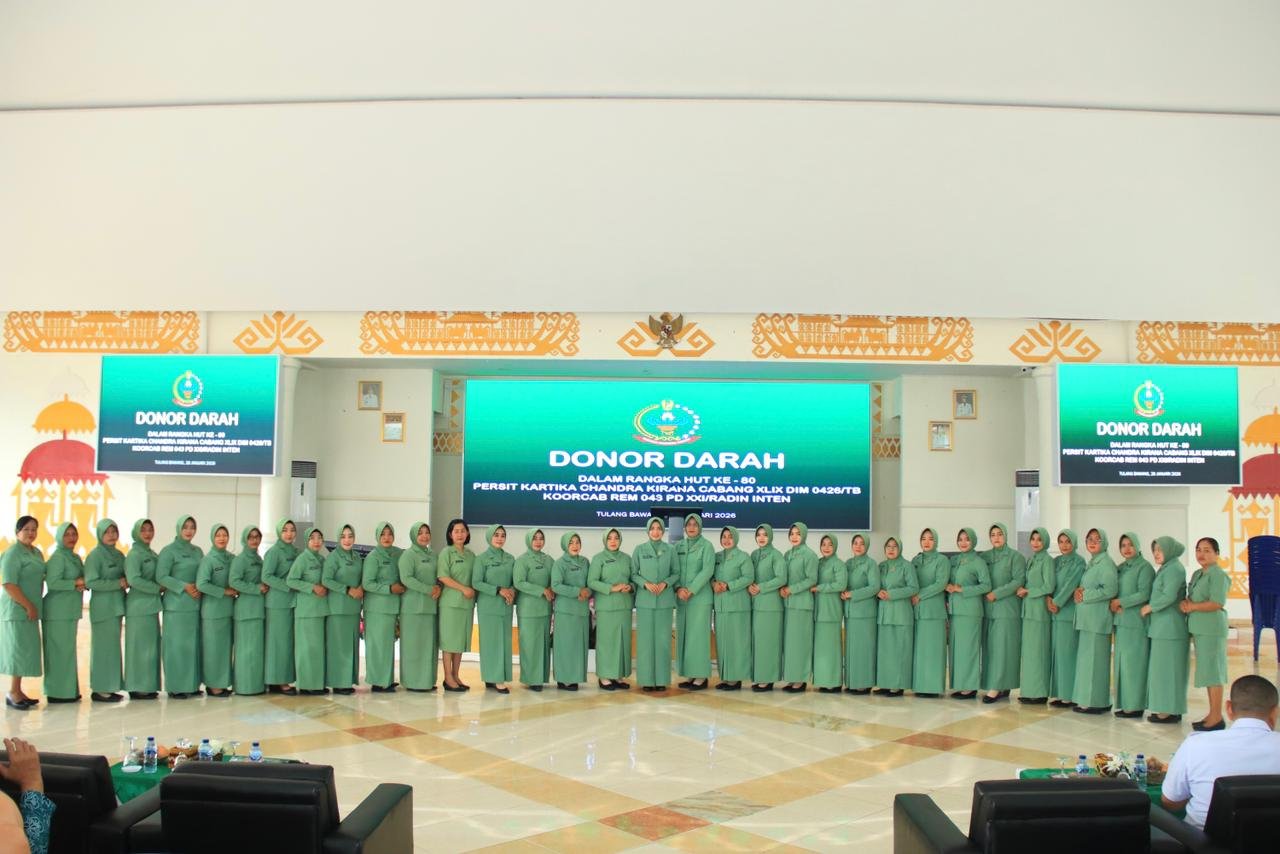 Menggala, Tulang Bawang – Dalam rangka merayakan Hari Ulang Tahun (HUT) ke-80 Persit Kartika Chandra Kirana (KCK), Kodim 0426/Tulang Bawang mengadakan kegiatan donor darah massal pada Rabu, 28 Januari 2026. Acara tersebut berlangsung di Gedung Serba Guna (GSG) di Jalan Cendana, Kelurahan Menggala Selatan, Kecamatan Menggala, Kabupaten Tulang Bawang.