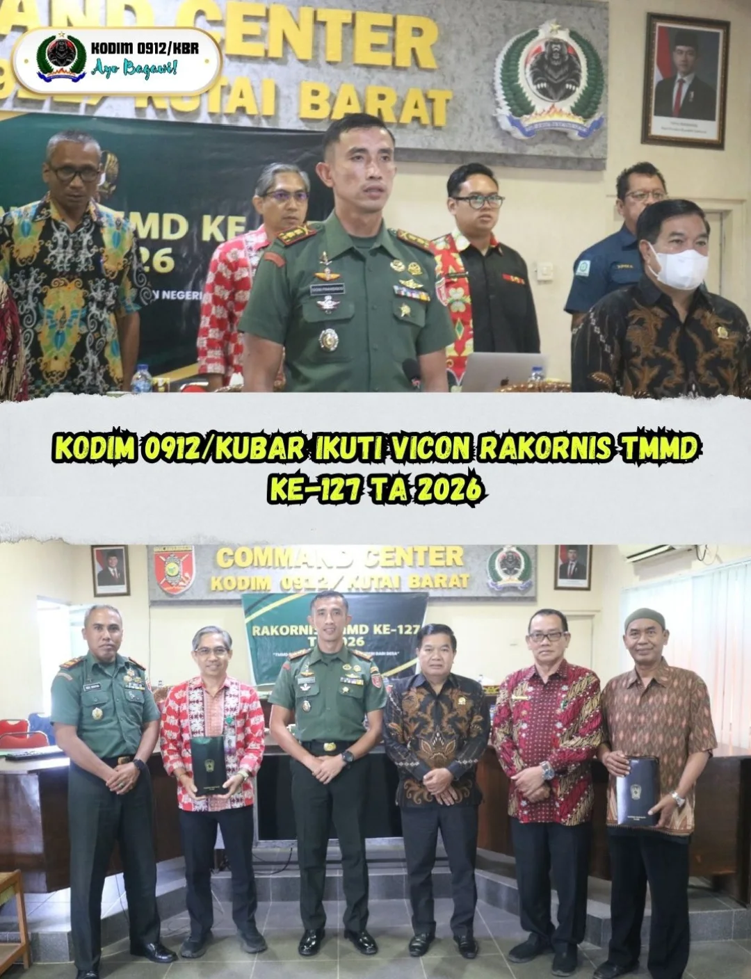 Kodim 0912/Kutai Barat mengadakan Rapat Koordinasi Teknis (Rakornis) TNI Manunggal Membangun Desa (TMMD) ke-127 untuk Tahun Anggaran 2026 melalui Video Conference (Vicon) pada Kamis, 29 Januari 2026. Kegiatan yang mengambil tema “TMMD Satukan Langkah Membangun Negeri dari Desa” ini berlangsung di Ruang Command Center Kodim 0912/Kubar, yang terletak di Jalan Gajah Mada, Kelurahan Barong Tongkok, Kecamatan Barong Tongkok, Kabupaten Kutai Barat.