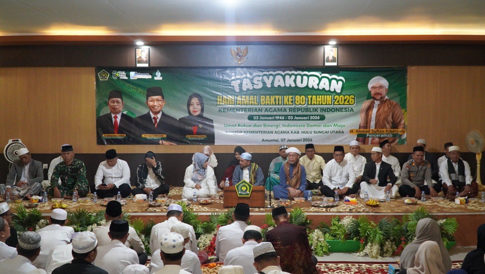 Peringatan Hari Amal Bakti ke-80 ini menjadi momentum refleksi bagi seluruh jajaran Kemenag untuk terus meningkatkan kualitas pelayanan publik serta memperkuat nilai-nilai moderasi beragama. Kegiatan tasyakuran berlangsung dengan khidmat dan penuh kebersamaan, dihadiri oleh unsur Forkopimda, tokoh agama, serta tamu undangan lainnya.