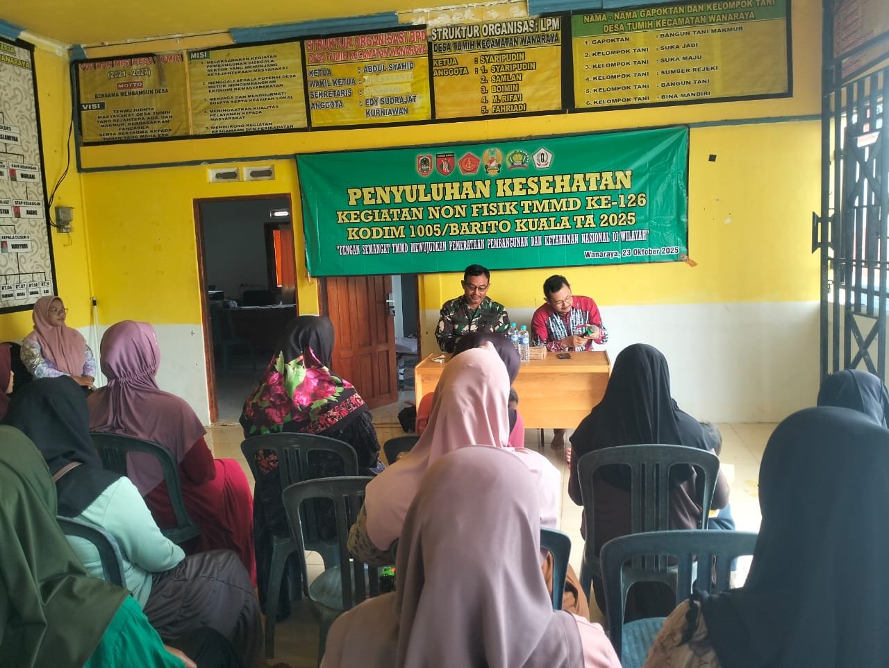 BARITO KUALA – Dalam rangka mendukung program TNI Manunggal Membangun Desa (TMMD) ke-126, Kodim 1005/Barito Kuala melaksanakan kegiatan nonfisik berupa penyuluhan kesehatan bagi warga Desa Tumih, Kecamatan Wanaraya, Kabupaten Barito Kuala, Kamis (23/10).