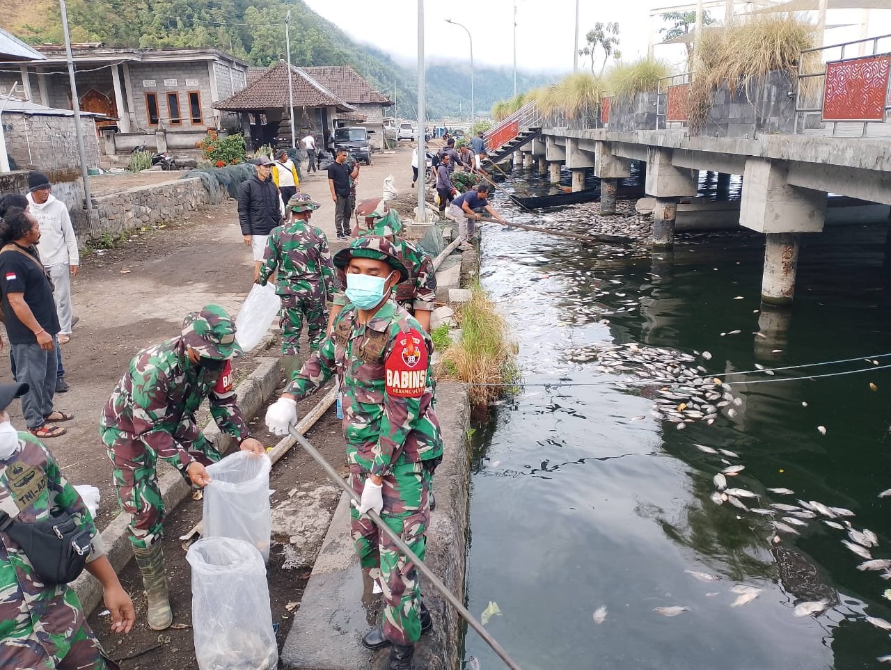 Bangli – Kodim 1626/Bangli bersama sejumlah instansi pemerintah dan masyarakat melaksanakan kegiatan pembersihan ikan-ikan mati di kawasan Danau Batur, Desa Terunyan, Kecamatan Kintamani, Kabupaten Bangli. Kegiatan ini dilakukan sebagai respon cepat terhadap fenomena perubahan warna air danau akibat semburan belerang yang mengakibatkan matinya sejumlah besar ikan di perairan tersebut.