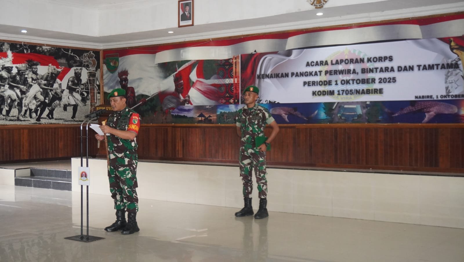 Nabire – Kodim 1705/Nabire menggelar acara Korps Raport kenaikan pangkat Perwira, Bintara dan Tamtama bertempat di Aula Makodim 1705/Nabire, Rabu (01/10/2025).