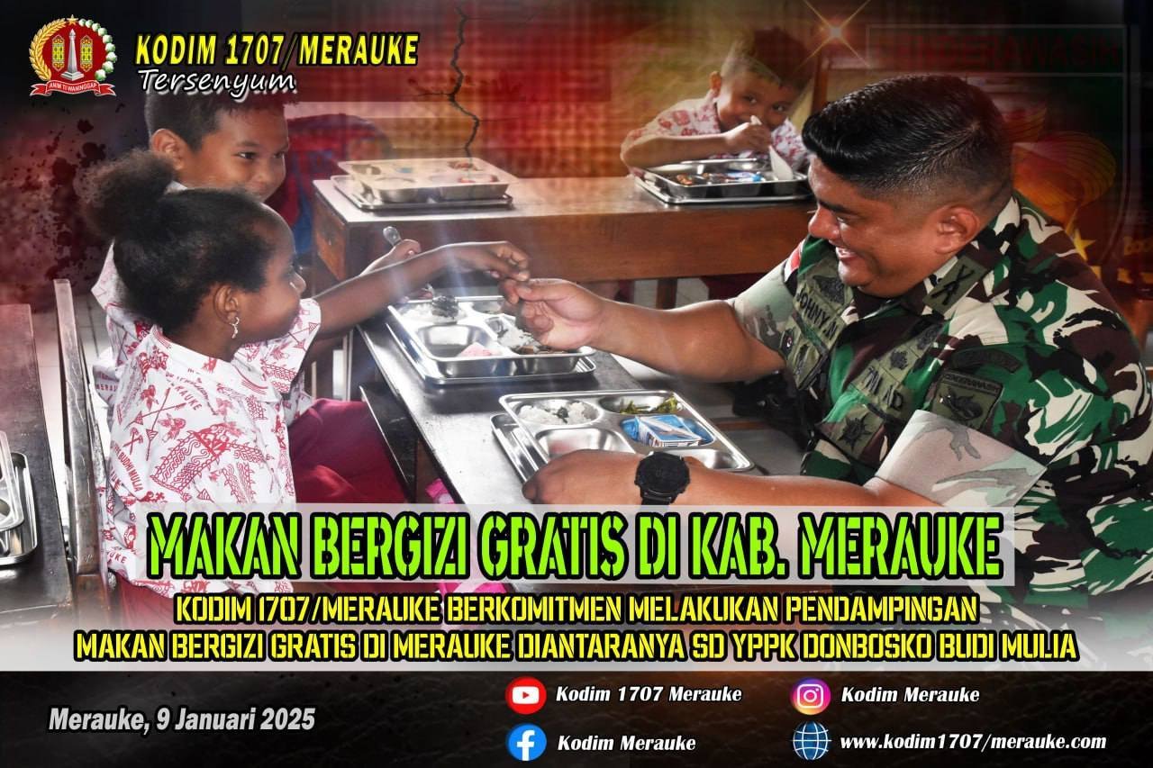 Kodim 1707/Merauke yang dipimpin langsung oleh Dandim 1707/Merauke Letkol Inf Johny Nofriady, S.E., M.Han didampingi Sekda Kab. Merauke Yeremias Ruben Ndiken melaksanakan uji coba makan bergizi gratis bertempat di Sekolah Dasar YPPK Donbosko Budi Mulia yang berada di Jln. Aru Kota Merauke – Provinsi Papua Selatan.