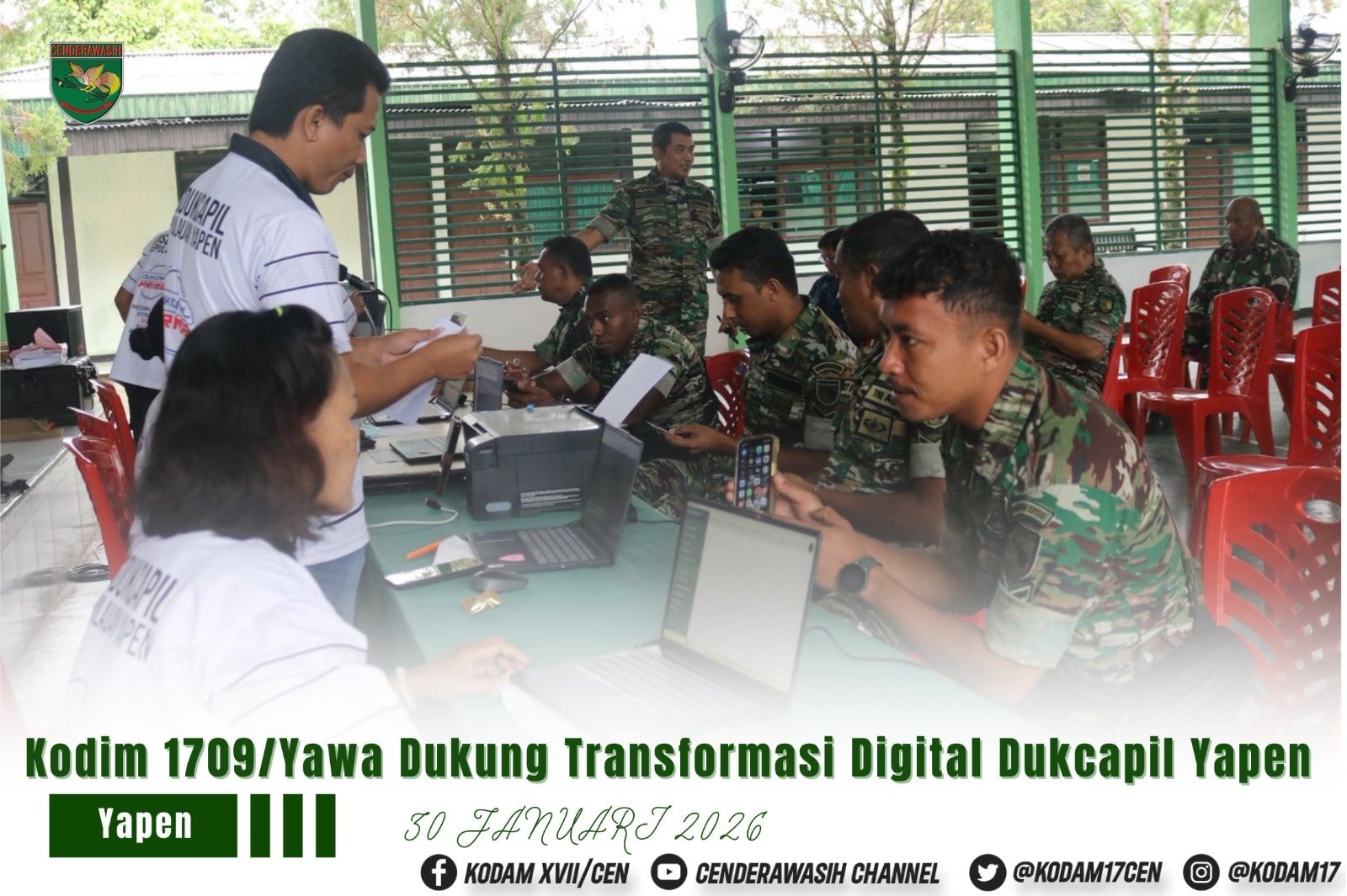 Kepulauan Yapen, 30 Januari 2026 – Kodim 1709/Yawa menunjukkan komitmennya dalam mendukung transformasi digital pemerintah dengan mengikuti kegiatan sosialisasi pendaftaran data kependudukan secara digital. Acara ini digelar di Aula Jenderal Sudirman, Jalan Maluku, Distrik Anotaurei, dan diselenggarakan oleh Dinas Kependudukan dan Pencatatan Sipil (Dukcapil) setempat.