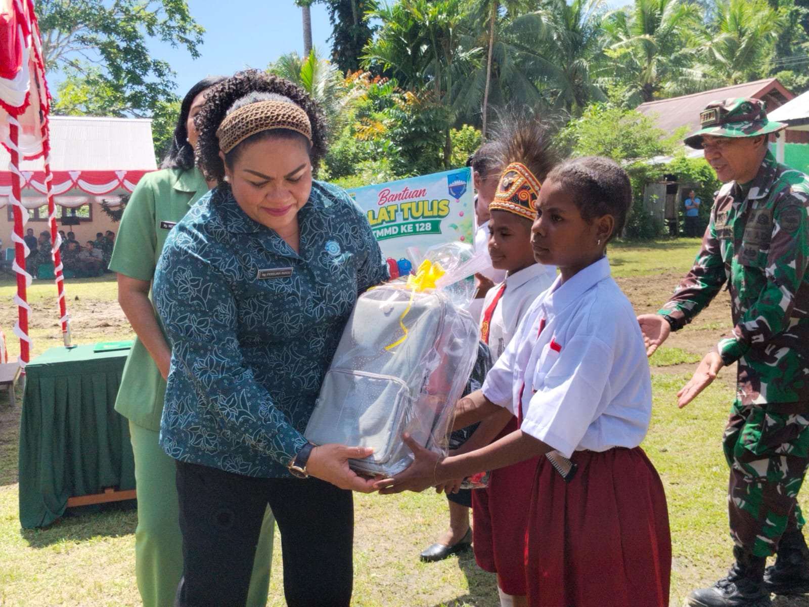 Setelah pembukaan resmi, kegiatan dilanjutkan dengan penyaluran bantuan sembako kepada warga serta pemberian buku tulis kepada siswa dari Persit Kartika Chandra Kirana Daerah XVIII/Kasuari.