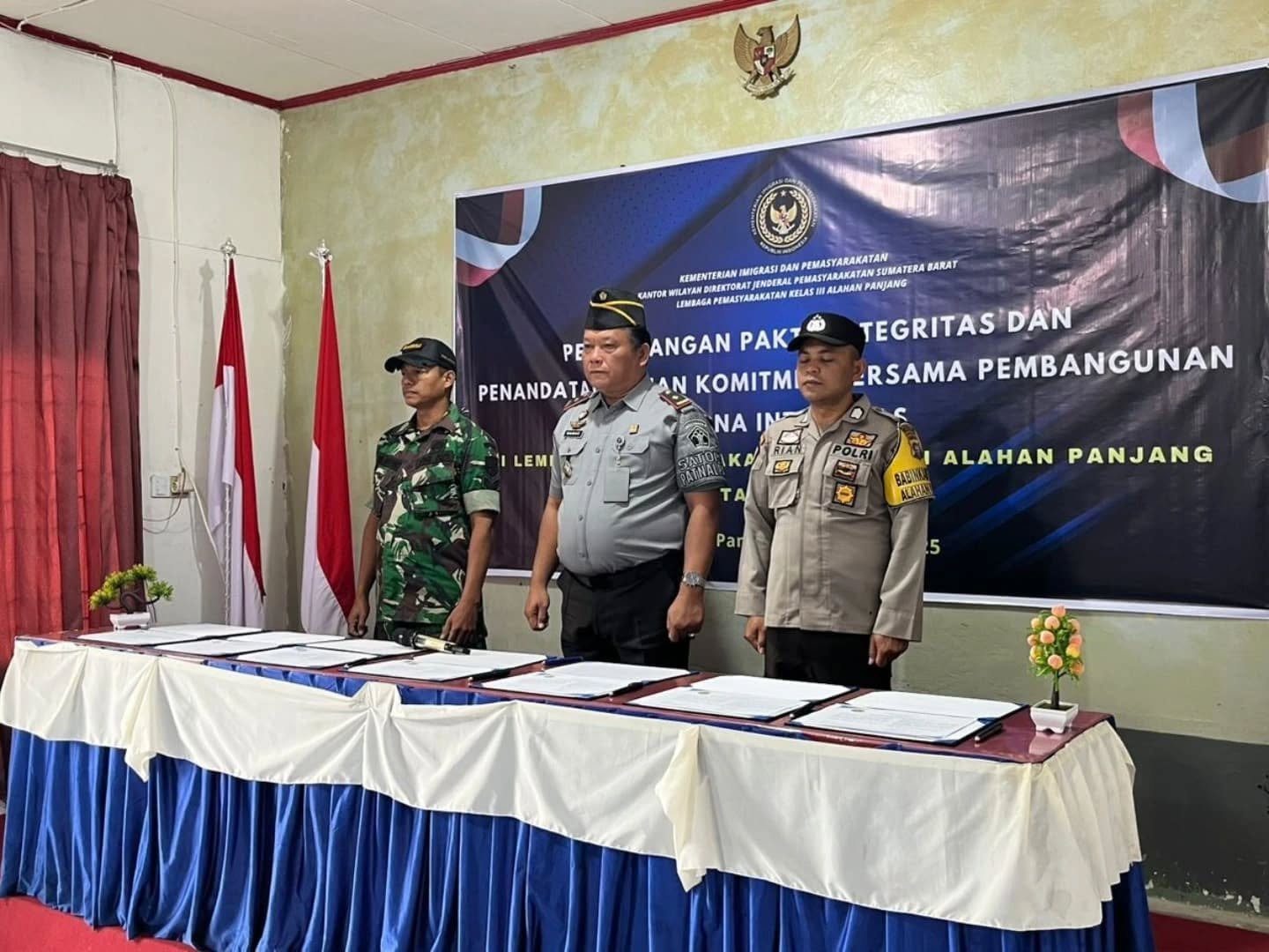 Sebagai bentuk komitmen dalam upaya Pembangunan Zona Integritas menuju wilayah bebas dari korupsi (WBK) dan wilayah birokrasi bersih dan melayani (WBBM), Danramil 10/Lembah Gumanti Kodim 0309/Solok diwakili Babinsa Serka Edi Anton hadiri apel Pencanangan Pakta Integritas, Penandatanganan komitmen bersama untuk pembangunan zona integritas tahun 2025 di Lapas Kelas III Alahan Panjang, Jumat 24 Januari 2025.