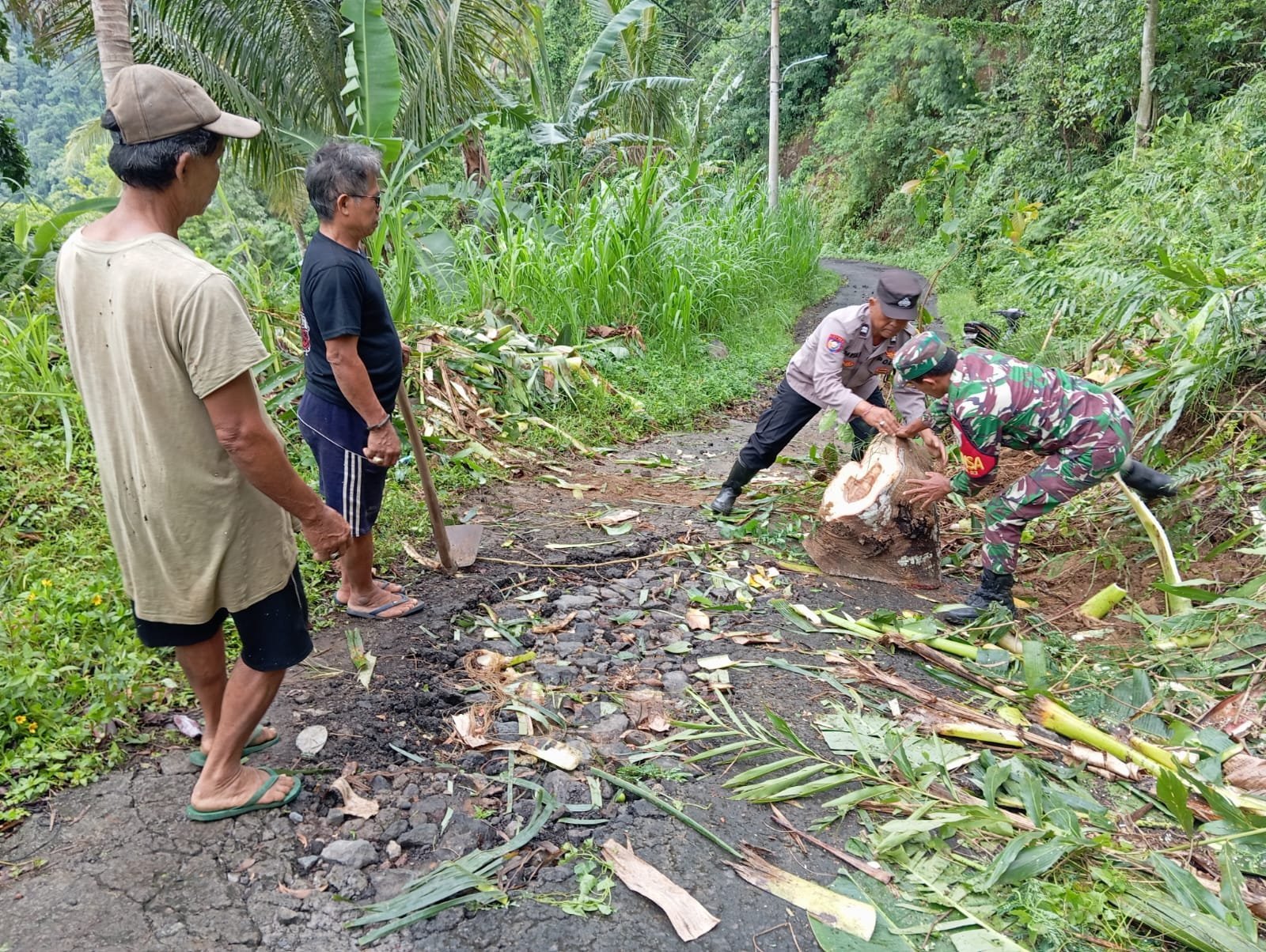 Disela evakuasinya, Babinsa Koptu Alit menyampaikan bahwa musibah longsor ini terjadi semalam, dimana longsoran tanah menutup sebagian badan jalan.
