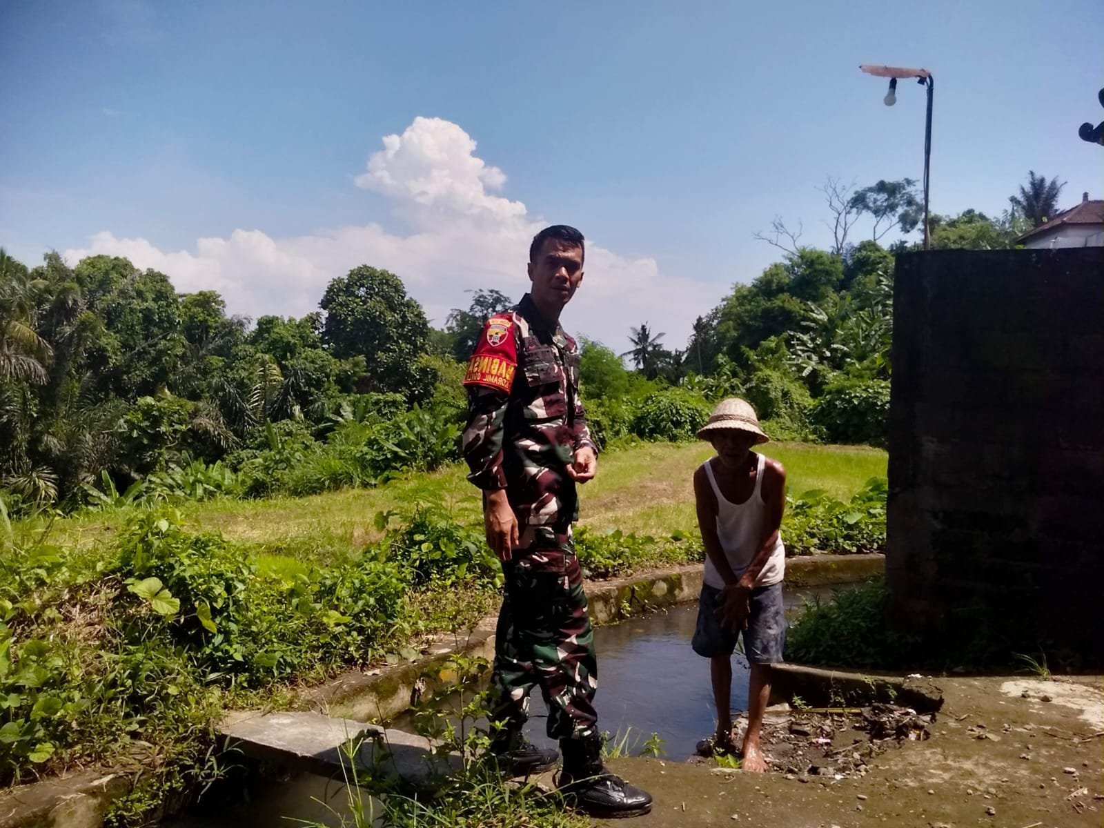 Tampak di lokasi, babinsa Koptu Wayan Sutamaya yang didampingi warga Ketut Parsa menyisir aliran sungai yang mengairi persawahan di Subak Jero Kuta Kawan.