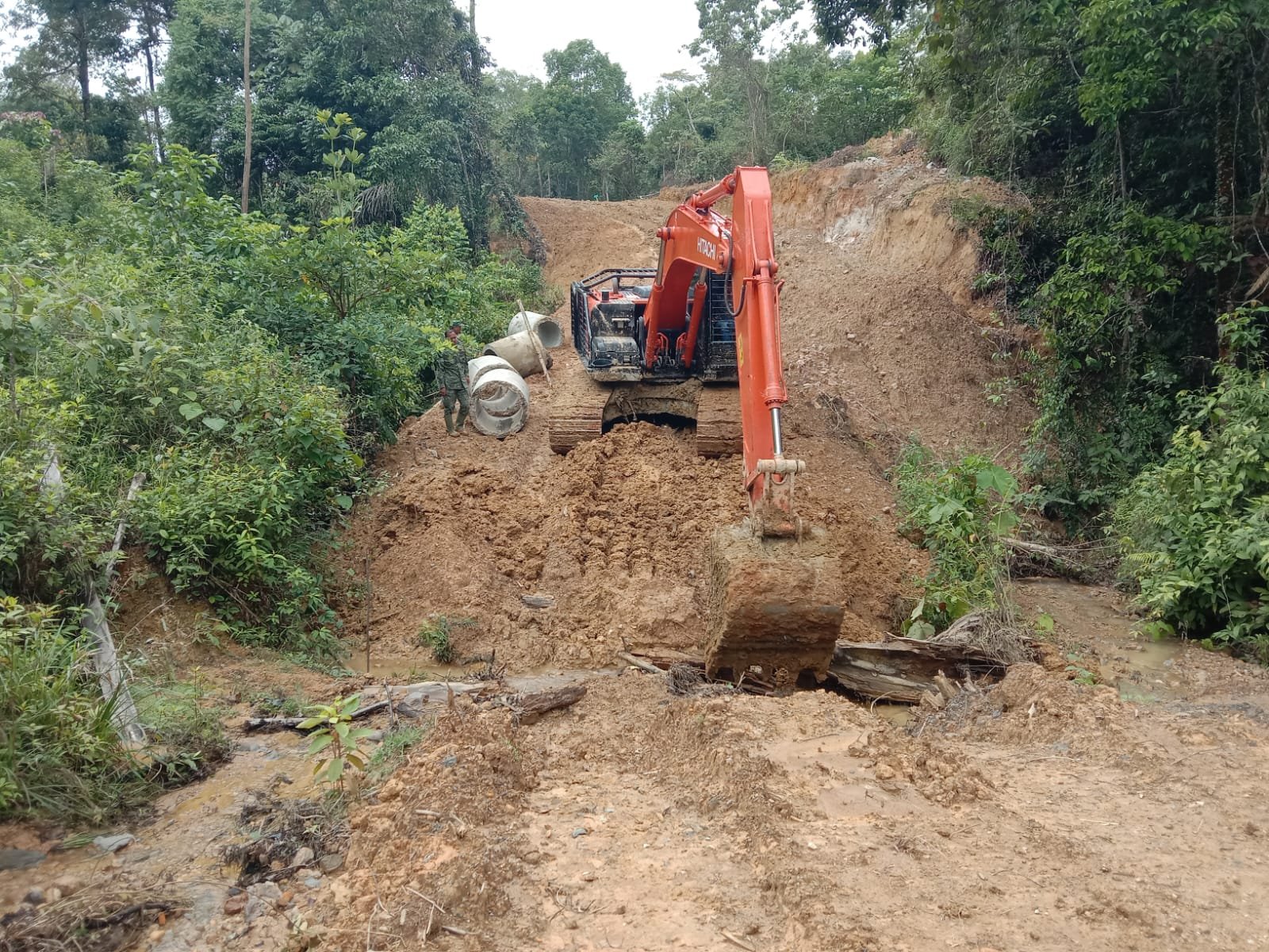 Anggota Satgas TMMD terlihat tetap bersemangat melaksanakan pekerjaan pembangunan drainase atau irigasi menggunakan gorong-gorong. Kondisi berpuasa tidak mengurangi dedikasi prajurit dalam menyelesaikan sasaran fisik program.