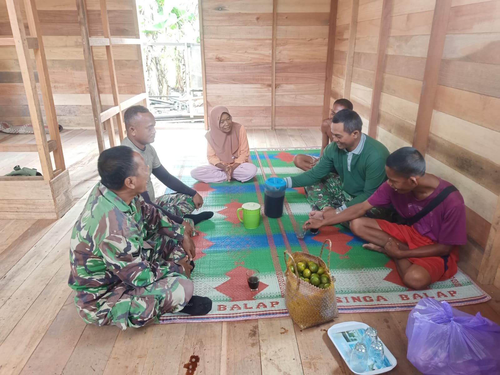 BARITO KUALA – Di sela-sela padatnya kegiatan fisik, suara tawa kecil terdengar dari sudut rumah sederhana milik Kai Salamun di Desa Tumih, Kecamatan Wanaraya. Rabu (21/10), Sejumlah prajurit Satgas TMMD Ke-126 Kodim 1005/Barito Kuala tampak duduk bersila di tanah, bercengkrama hangat dengan anak dari Kai Salamun — anak istimewa dengan keterbelakangan mental yang tetap menebar senyum tulus kepada siapa pun yang menyapanya.