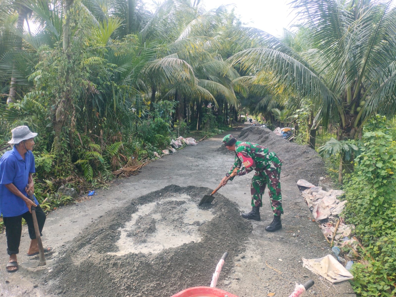 Di TKP, tampak Babinsa menjadi Motor Penggerak sekaligus menjadi pemantik api semangat bagi warga pada saat melakukan proses penyiapan bahan material pengecoran.