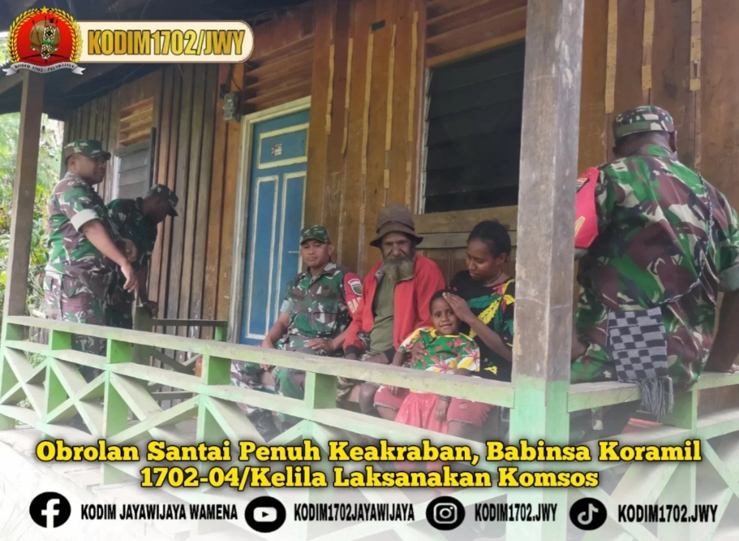 Kegiatan Komsos tersebut dipimpin oleh Serma Udin yang didampingi oleh empat anggota Koramil 1702-04/Kelila. Mereka mengunjungi rumah Bapak Paul Wanimbo, seorang gembala setempat, dan berbincang dengan anak-anak serta warga lainnya.