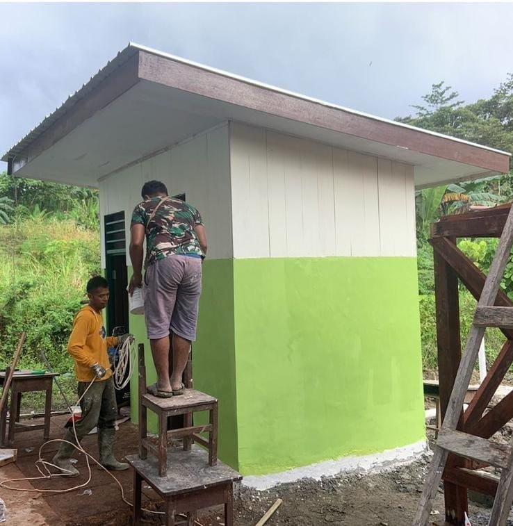 Pembangunan MCK/WC di SD Inpres Manunggal Jaya yang menjadi salah satu sasaran fisik TMMD ke-125 TA. 2025 Kodim 1705/Nabire kini