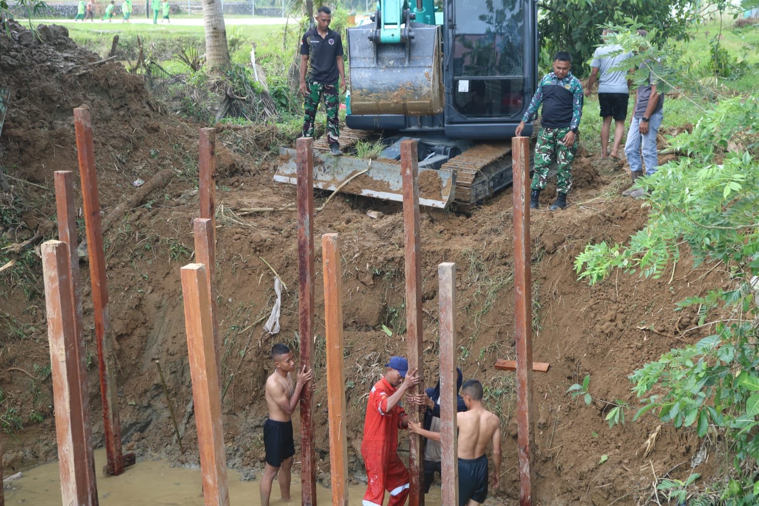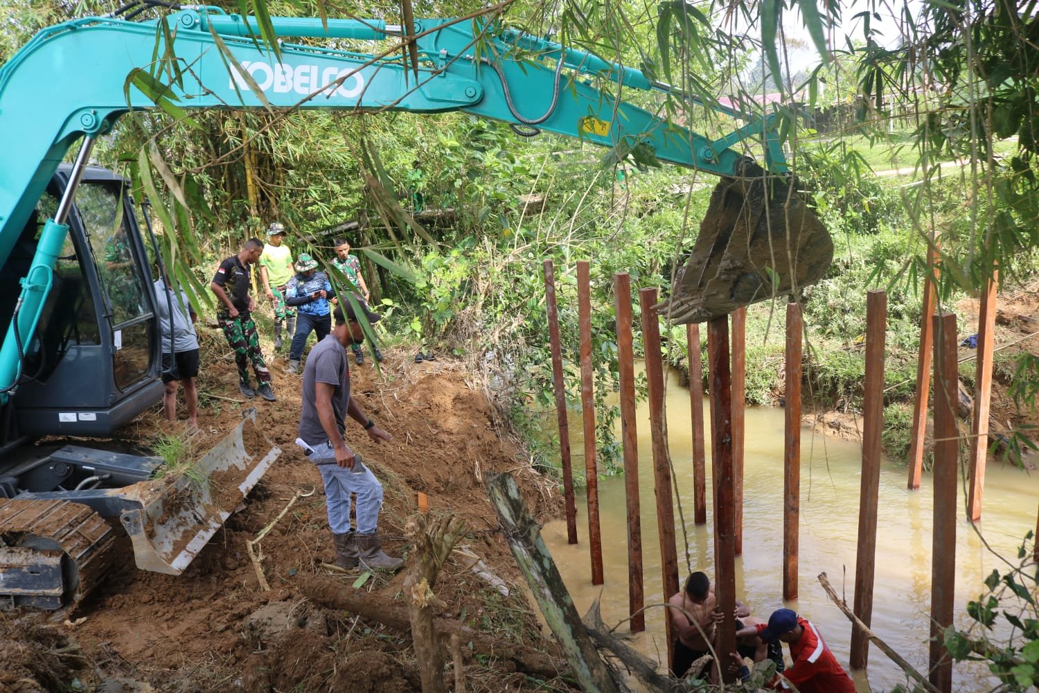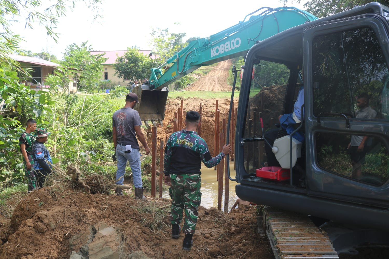 Kutai Timur – Alat berat jenis eksavator dikerahkan dalam proses pemasangan tiang pancang jembatan yang menjadi salah satu sasaran fisik