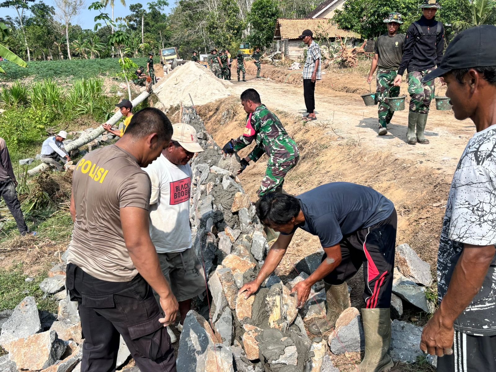 Pemandangan penuh semangat dan kebersamaan tampak di lokasi pembangunan tanggul penahan jalan di Kampung Moris Jaya, Kecamatan Banjar Agung. Proyek