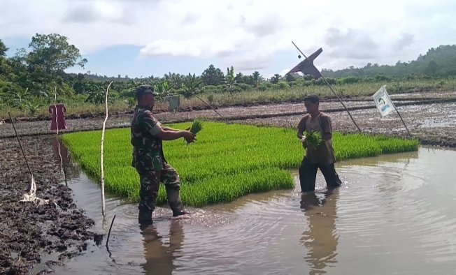 Babinsa Posramil Darul Hikmah Serda M. Hasan Turun Langsung Bantu Petani Cabut Bibit Padi di Desa Blang Dalam