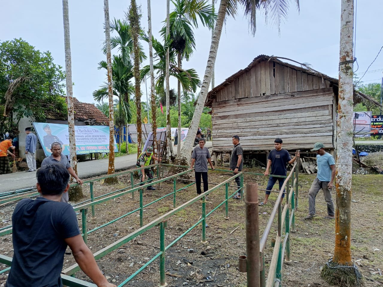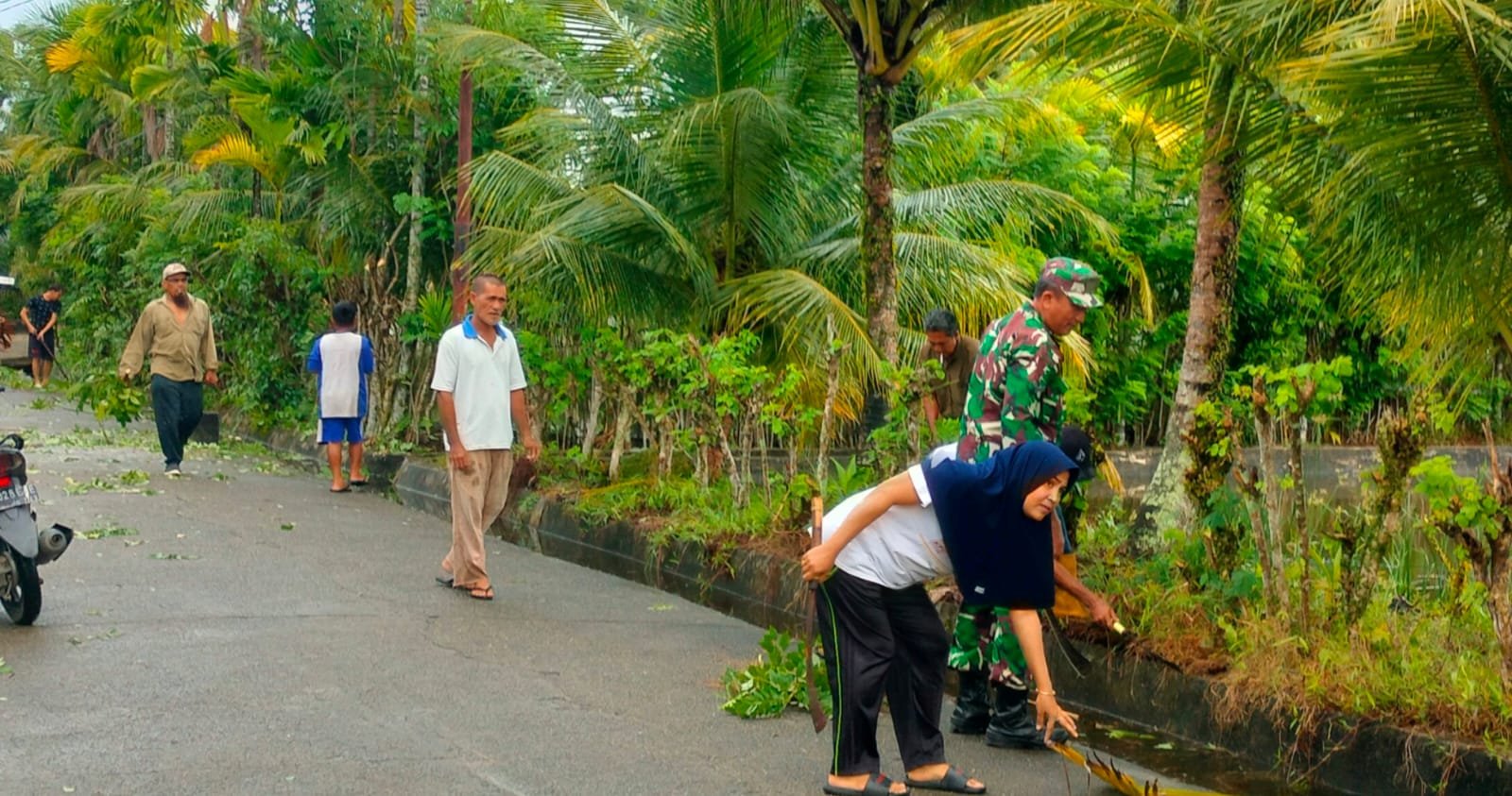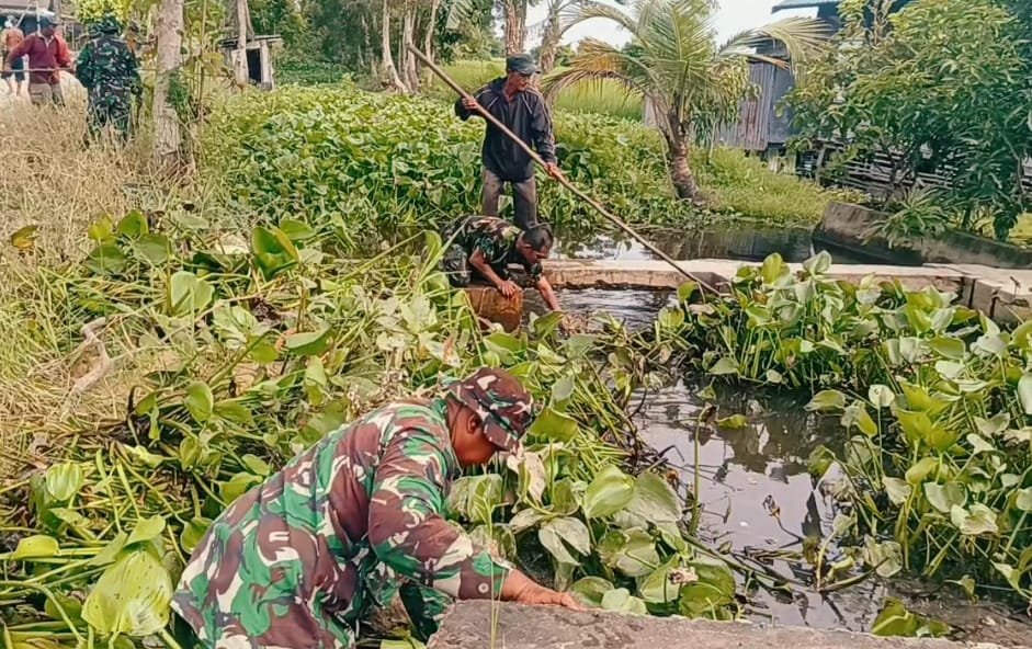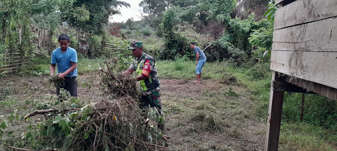 ACEH BARAT – Babinsa Posramil 12/Panton Reu Kodim 0105/Aceh Barat, Serka Julha Pasi, melaksanakan kegiatan gotong royong bersama warga untuk