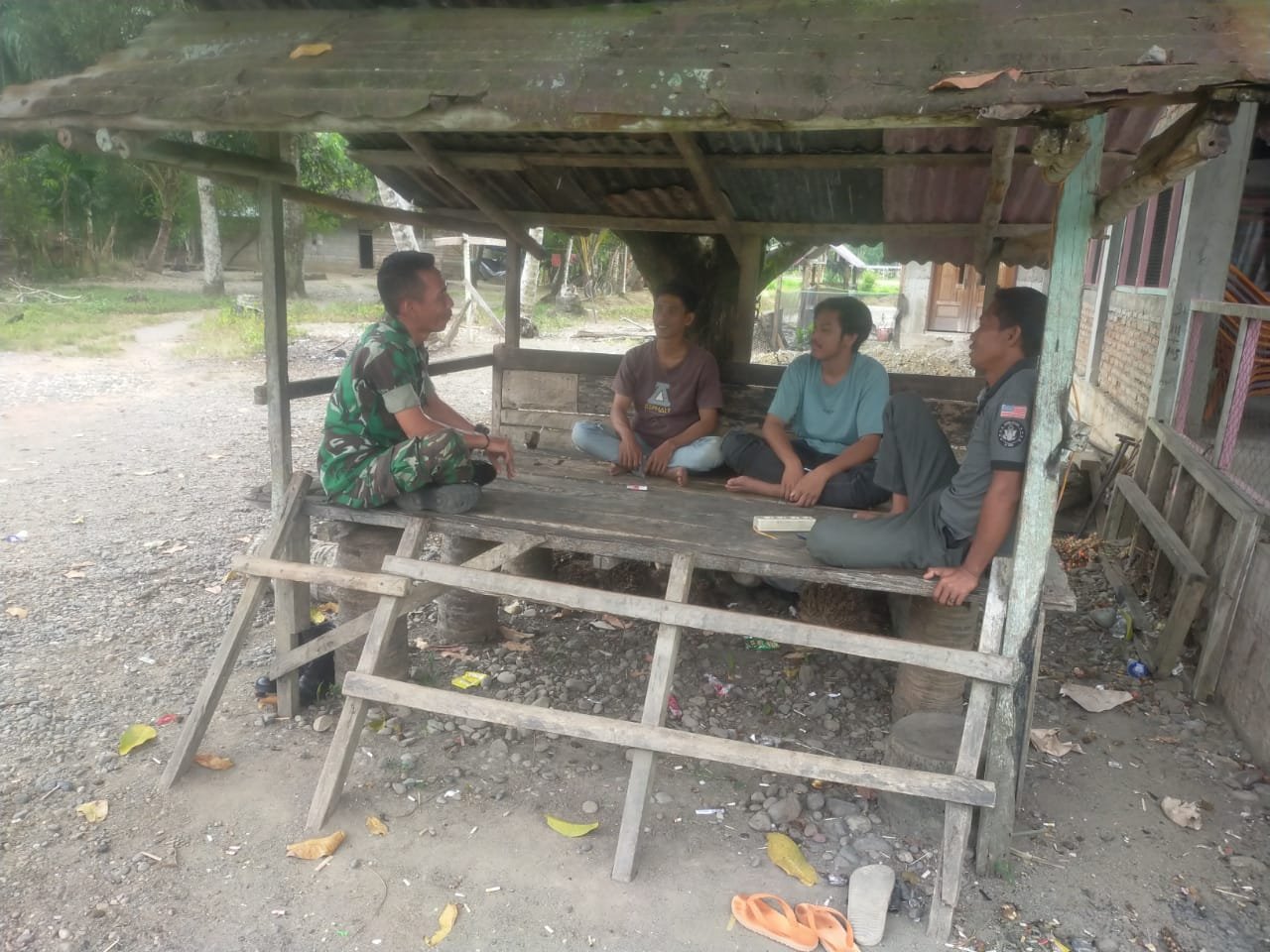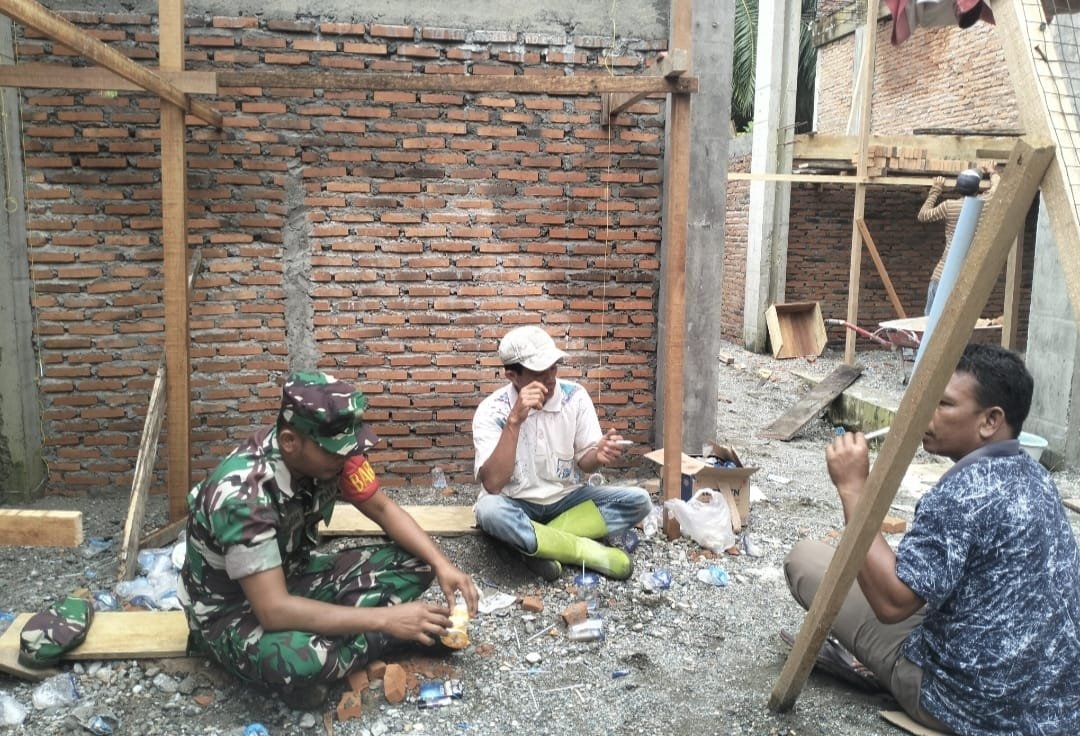 ACEH BARAT – Babinsa Koramil 04/Meureubo Kodim 0105/Aceh Barat, Sertu Bahari Saragih, menjalin komunikasi sosial dengan para pekerja bangunan sebagai