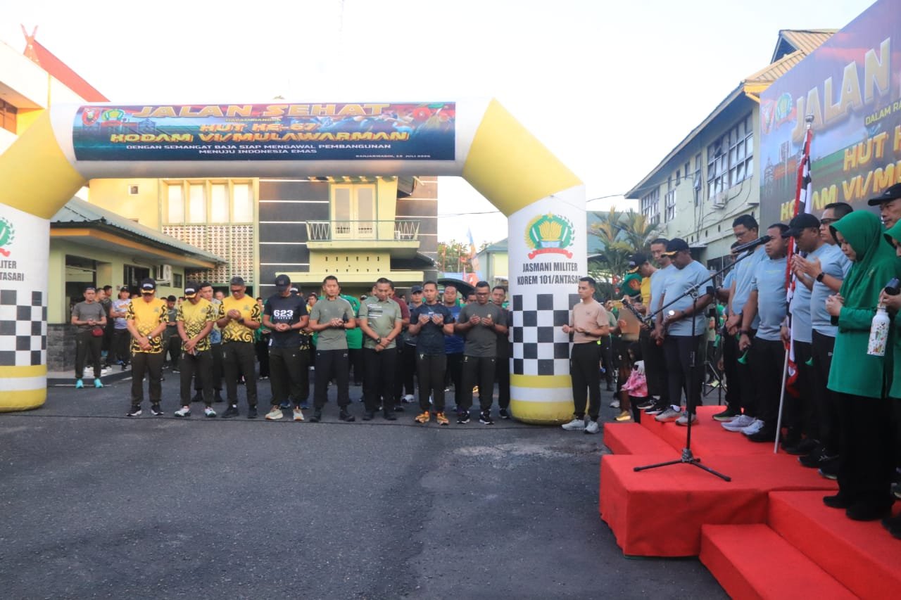 BANJARMASIN – Semarak Hari Ulang Tahun (HUT) ke-67 Kodam VI/Mulawarman diramaikan dengan kegiatan jalan santai dan olahraga bersama yang digelar