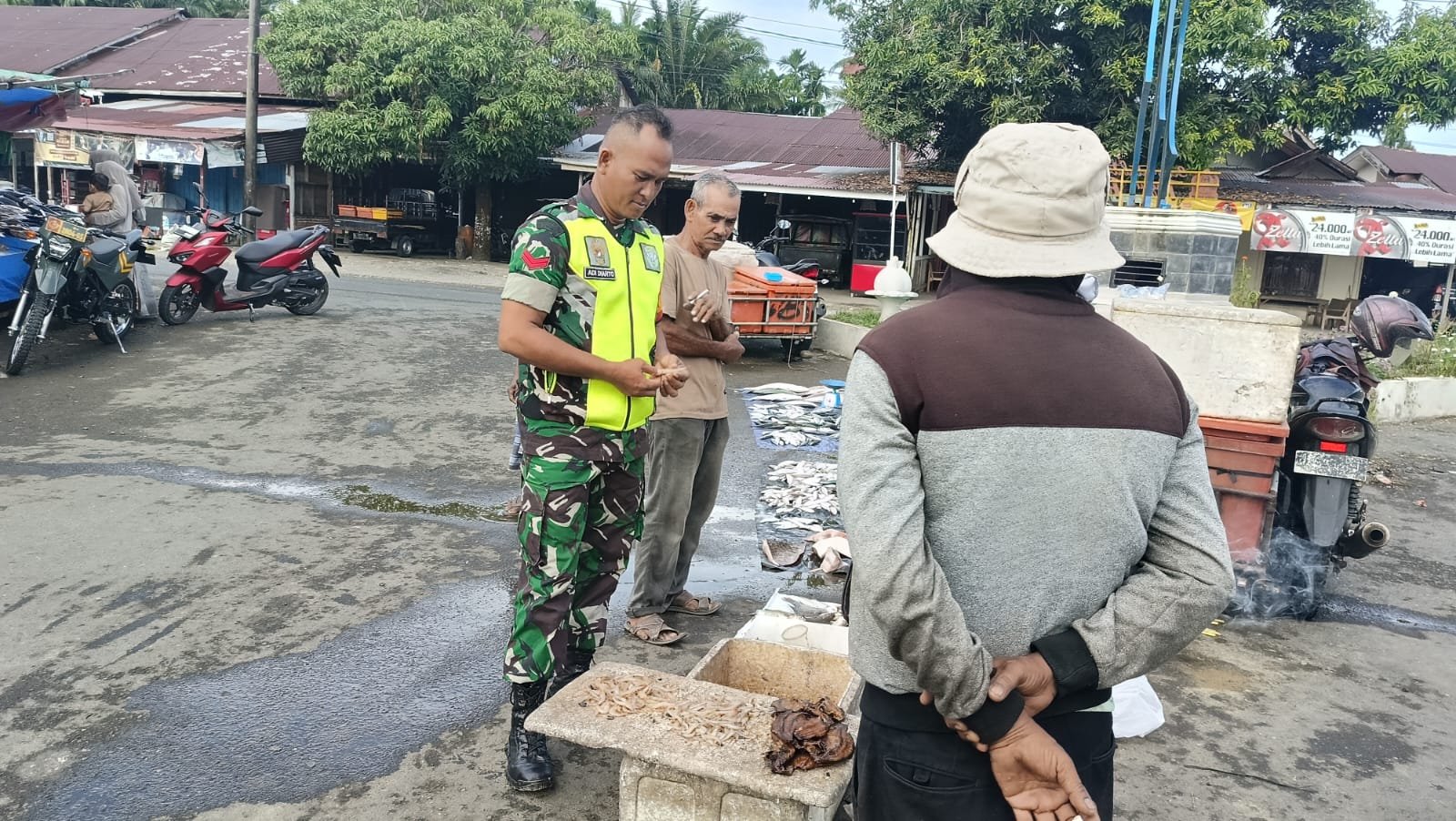 ACEH BARAT — Babinsa Koramil 08/Arongan Lambalek, Kodim 0105/Aceh Barat, melaksanakan pemantauan harga ikan di Desa Teupin Peuraho, Kecamatan Arongan