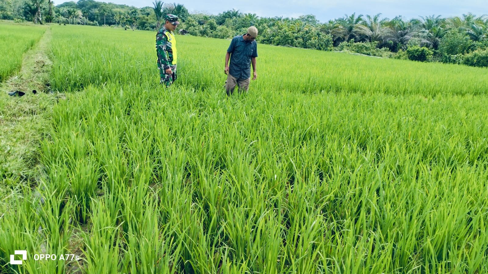 ACEH BARAT – Anggota Koramil 03 Kaway XVI Serma Mahyudi bersama warga melaksanakan pemantauan perkembangan tanaman padi di sawah di