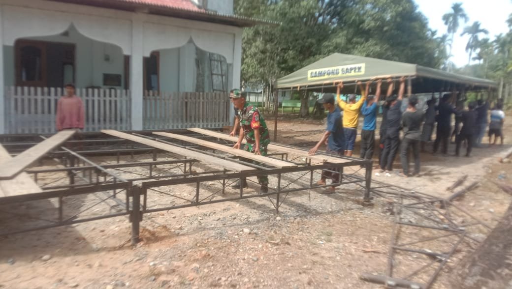 Aceh Jaya – Semangat kebersamaan dan gotong-royong, Babinsa Koramil 0114-04/Setia Bakti Serka Parwoto bantu warga binaannya mendirikan tenda untuk acara