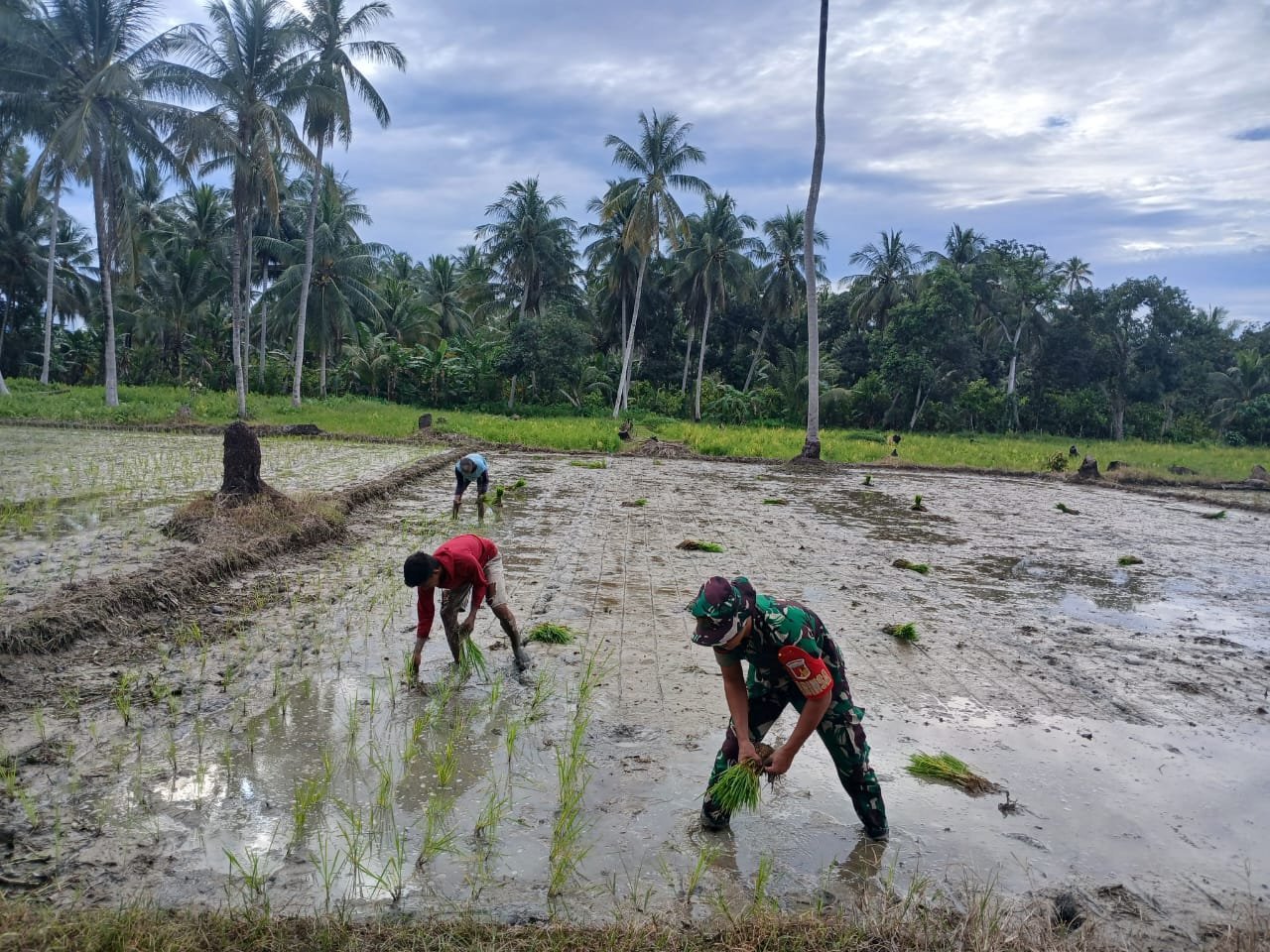 Tolitoli – Babinsa Koramil 1305-10/Damsel Pratu Andi melaksanakan kegiatan hanpangan membantu penanaman padi jenis mekongga milik Bapak Buman di lahan