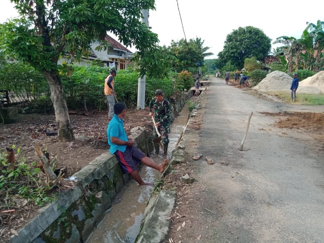 Meraksa Aji (Tulang Bawang) — Sertu Sukardi Babinsa 426-05/PA, Kodim 0426 Tulang Bawang, melaksanakan kegiatan gotong royong dengan warga membersihkan