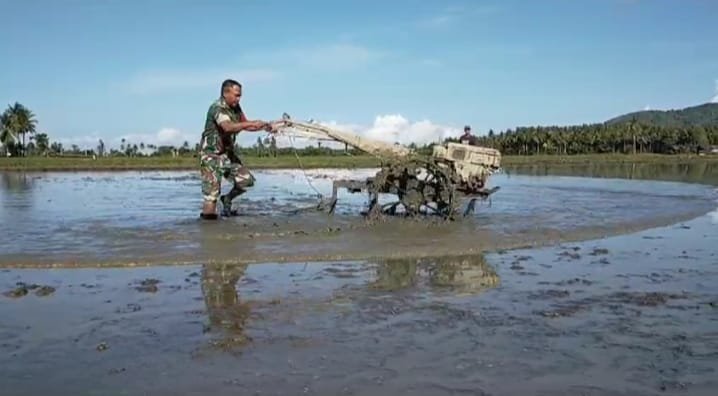 Tolitoli – Anggota Babinsa Koramil 1305-02/Tolitoli Utara Serda Abd Gafur melaksanakan pendampingan hanpangan membantu membajak sawah milik Bapak Ansar, yang