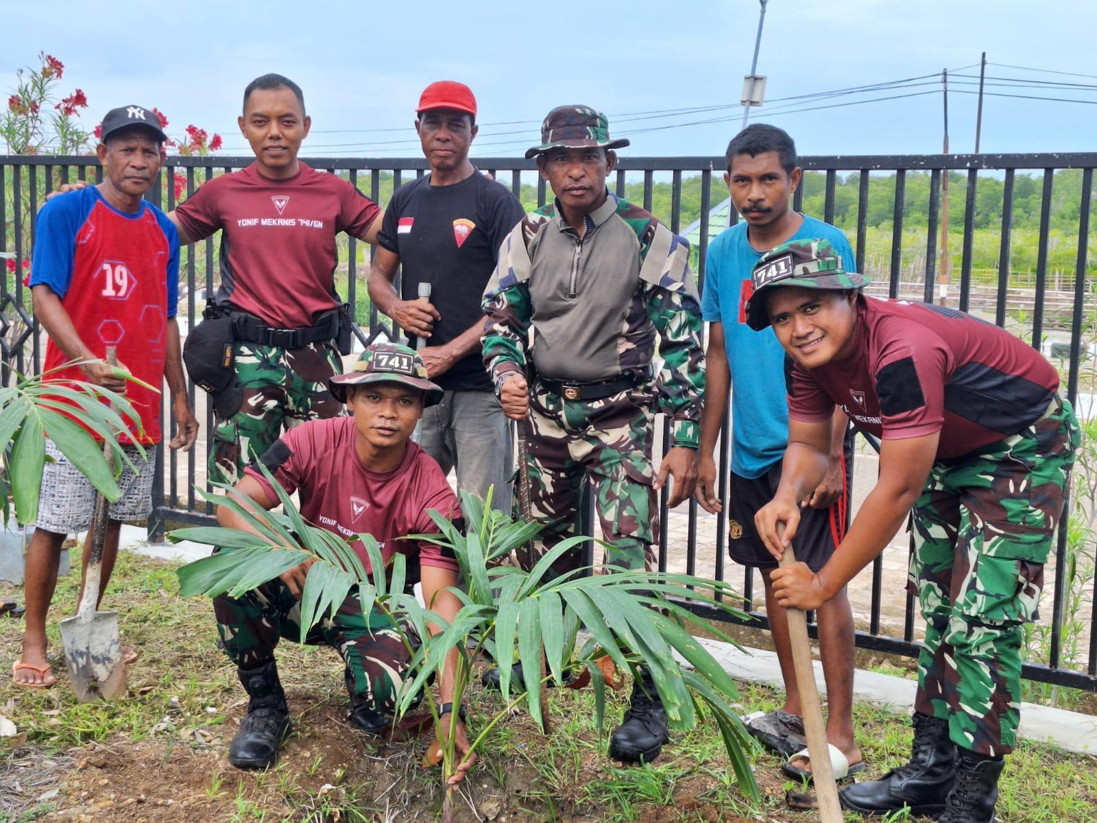 Ciptakan Lingkungan Gereja Yang Asri, Babinsa Bersama Satgas Pamtas dan Warga Tanam Pohon