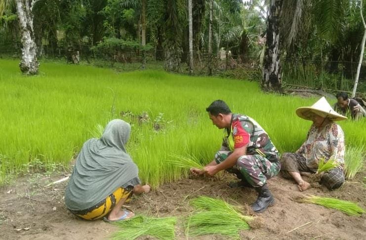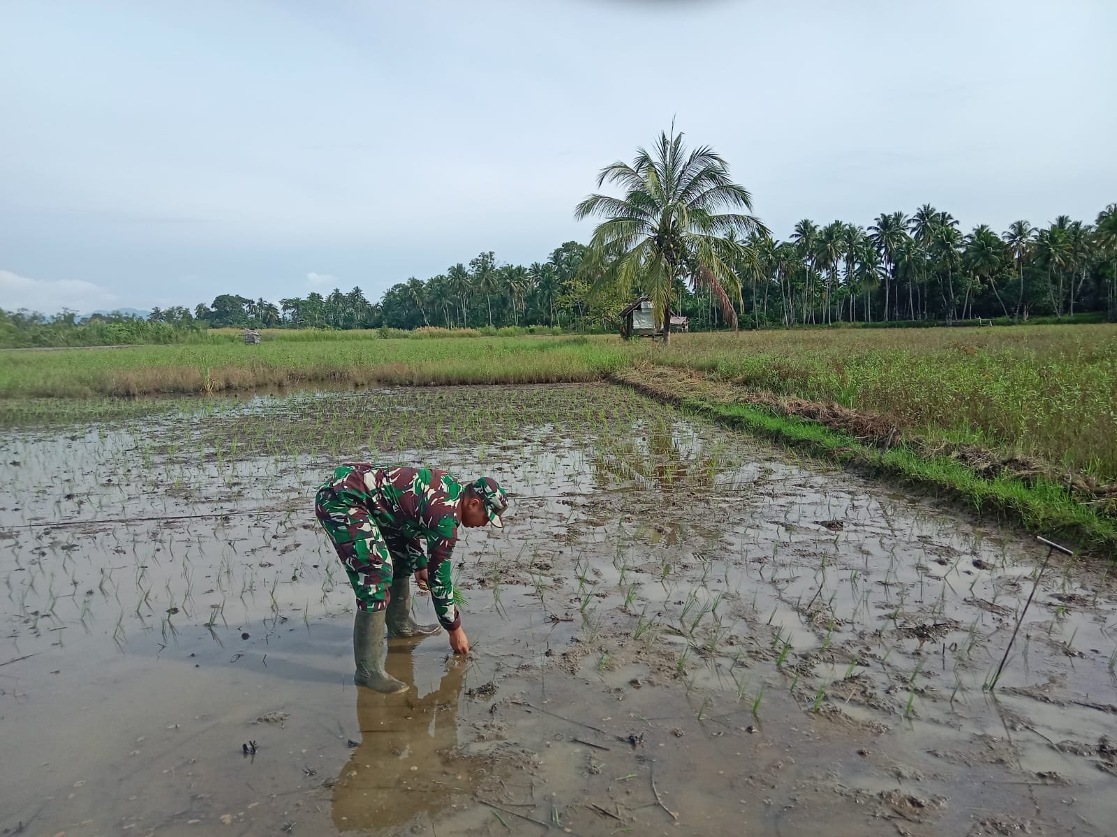 Aceh Jaya – Babinsa Koramil 06/Teunom Kodim 0114/Aceh Jaya Pratu Ardin Aritonang bersama warga binaan melaksanakan penanaman Padi dilahan bapak