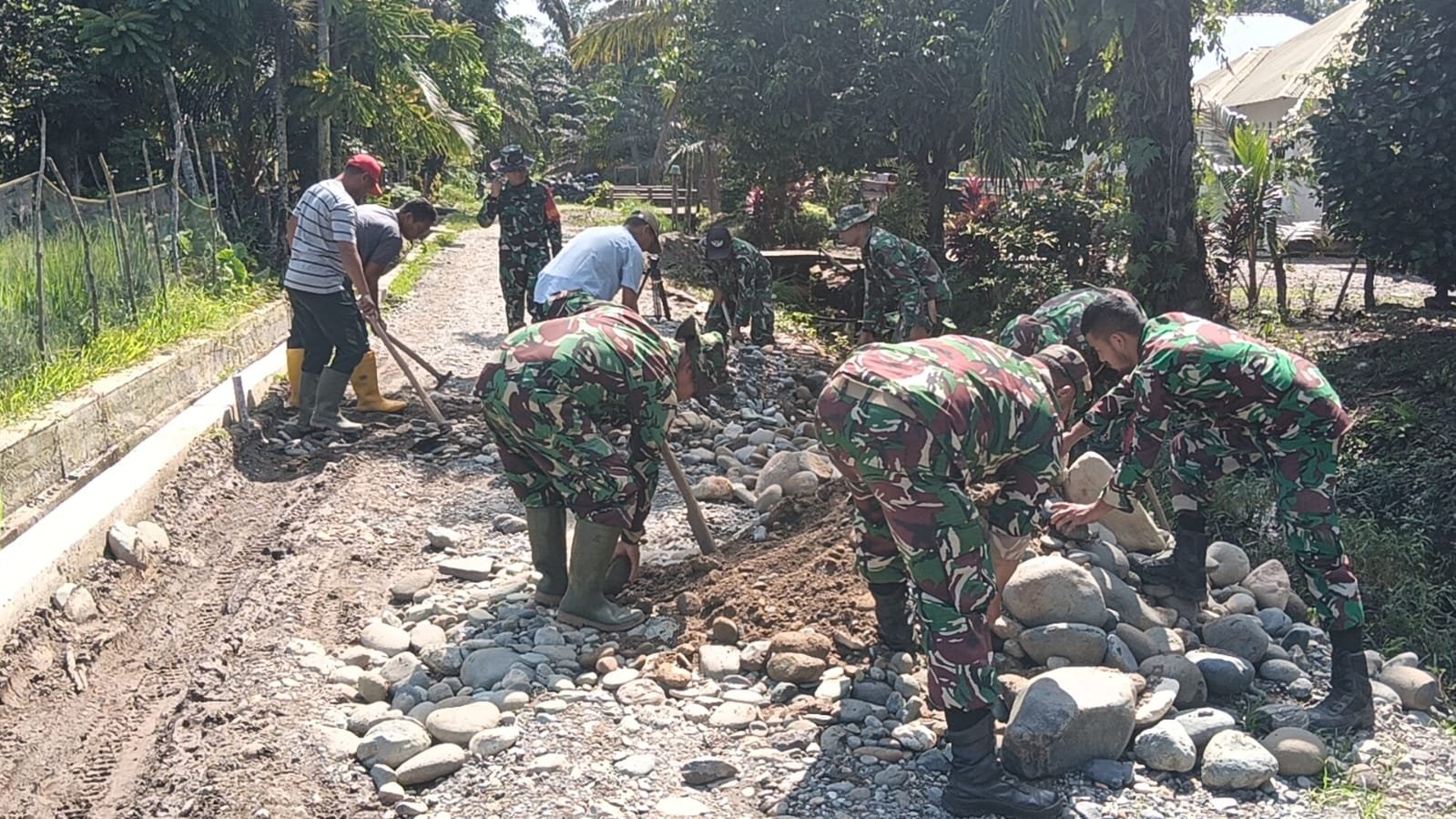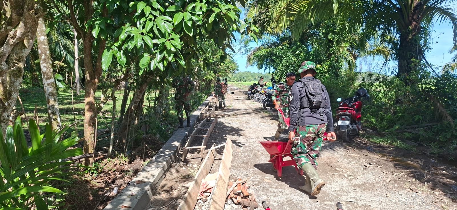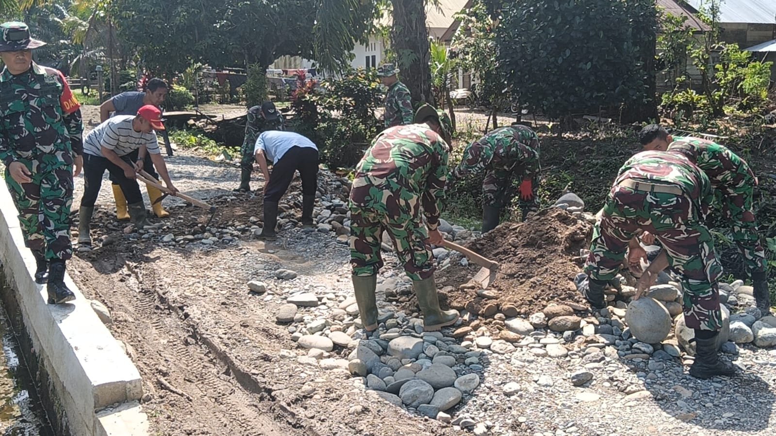 Aceh Barat – Suasana Desa Lueng Jawa tampak hidup sejak pagi. Suara adukan semen berpadu dengan langkah kaki personel Satgas