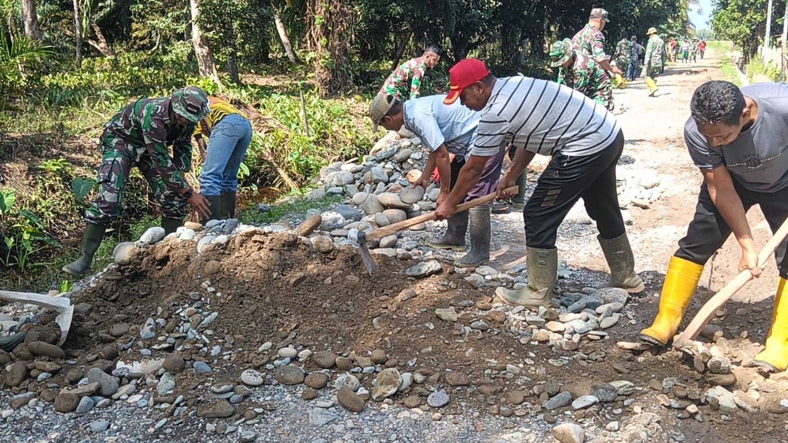 Aceh Barat – Desa Pasi Aceh kini dipenuhi suara kerja yang ritmis, seperti irama yang mengiringi pembangunan talut jalan oleh