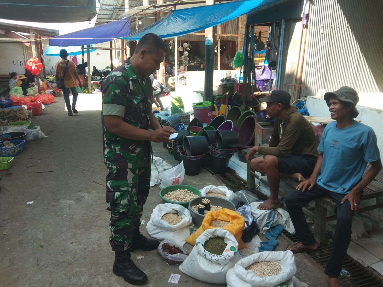 Serka Wai Purwanto mengatakan, kegiatan tersebut di laksanakan agar supaya dapat memonitoring terhadap perkembangan harga Sembako di pasar yang ada di wilayah Koramil 02/Tellu Limpoe terutama stok sembilan kebutuhan pokok yang ada di pasar, seperti beras, tepung, minyak goreng, telur, cabai, bawang dan lain sebagainya.