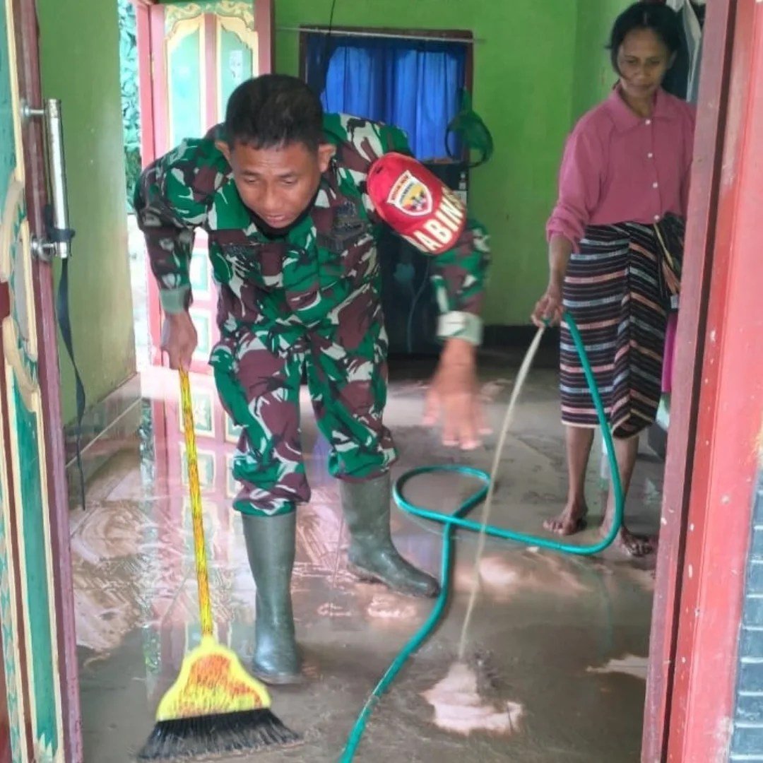 Babinsa Desa Buwun Mas bersama masyarakat setempat bekerja bahu-membahu membersihkan lumpur dan puing-puing dari dalam rumah serta lingkungan sekitar. Langkah ini dilakukan untuk mempercepat pemulihan kondisi wilayah yang terdampak banjir.