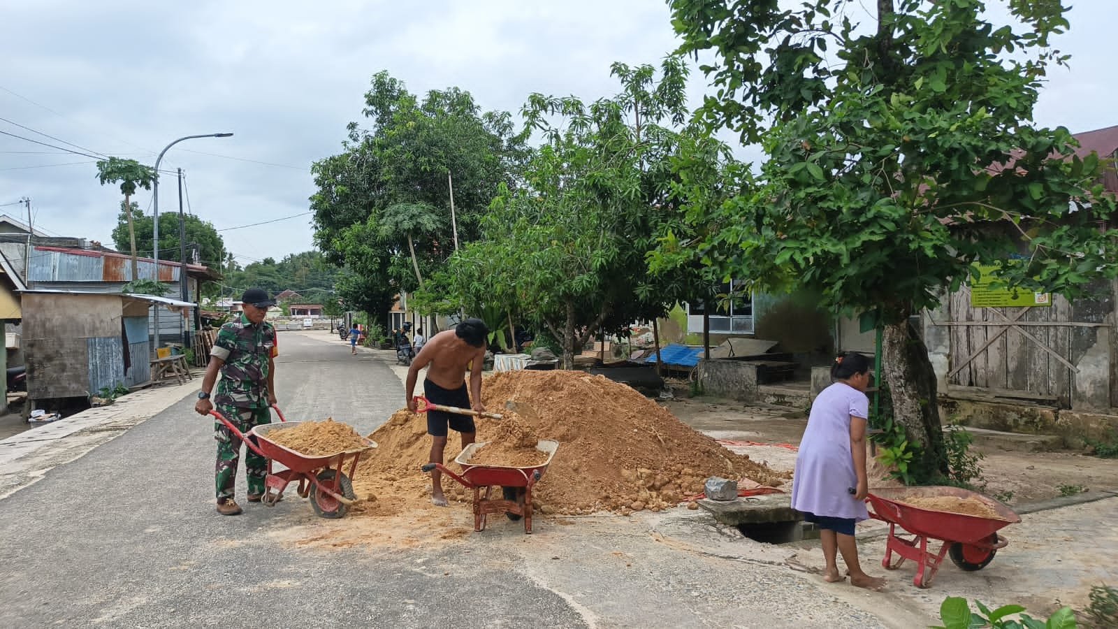 Meskipun harus berhadapan dengan tanah dan pasir, pasangan tersebut tidak kehilangan semangat dan terus berkolaborasi dengan anggota Satgas untuk mempercepat proses pembangunan. Partisipasi aktif warga seperti ini membuktikan bahwa program TMMD berhasil membangkitkan kembali nilai-nilai kebersamaan di masyarakat.