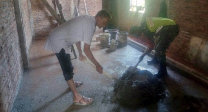 Dengan semangat gotong royong bermodalkan cangkul, Sertu Mukhlis mulai mengaduk campuran semen, pasir, dan air untuk mempercepat proses pengecoran bagian lantai rumah. Kehadiran Babinsa di tengah-tengah warga disambut dengan antusias dan rasa syukur.