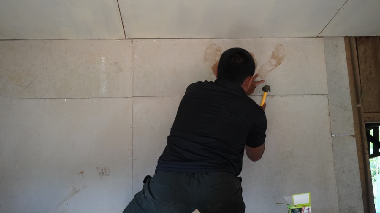Setelah menyelesaikan konstruksi struktur dan dinding, Satgas TMMD melanjutkan dengan pemasangan plafon bertujuan untuk memberikan kenyamanan dan kelayakan pada bangunan tersebut. Tim melakukan pekerjaan ini dengan teliti agar hasilnya rapi dan kokoh.
