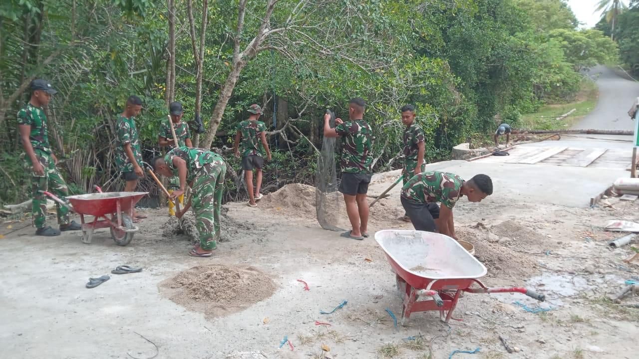 Kaimana – Program TNI Manunggal Membangun Desa (TMMD) ke-127 yang dilaksanakan oleh Kodim 1804/Kaimana menunjukkan perkembangan yang signifikan, terutama dalam pembangunan jembatan di Kampung Marsi, Distrik Kaimana, Kabupaten Kaimana. Pada Sabtu (07/03/2026), Satgas TMMD berkolaborasi dengan masyarakat setempat untuk melakukan pengecoran bagian ujung jembatan, yang bertujuan untuk meratakan pertemuan antara jembatan dan badan jalan. kegiatan ini dipimpin oleh Sertu Daniel Ndiken, Babinsa Kampung Marsi, dengan melibatkan sejumlah personel gabungan, termasuk 5 anggota TNI AD, 1 anggota TNI AL, dan 3 warga lokal. Melalui semangat gotong royong yang kuat, proses pengecoran berjalan dengan baik dan menunjukkan progres yang positif. Saat ini, pekerjaan ini telah mencapai sekitar 95 persen. Dengan hampir selesainya tahap pembangunan ini, diharapkan jembatan yang dibangun melalui program TMMD dapat segera dimanfaatkan oleh masyarakat, memberikan kemudahan akses transportasi dan mendukung aktivitas sehari-hari di Kampung Marsi.