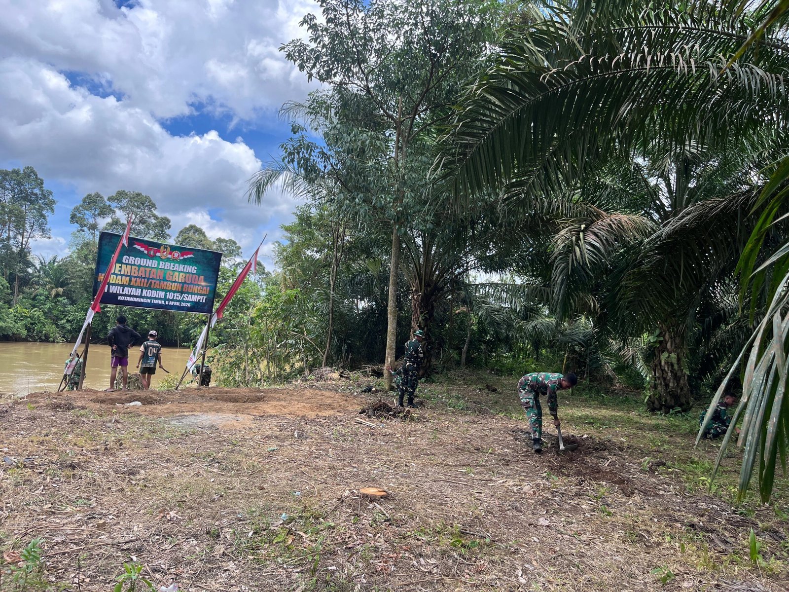 Kotawaringin Timur – Pembangunan Jembatan Garuda yang terletak di Desa Tukang Langit, Kecamatan Telaga Antang, Kabupaten Kotawaringin Timur, kini telah memasuki fase pengukuran dan pembersihan untuk persiapan penggalian pondasi pada Sabtu (11/04/2026). Proses pembangunan tersebut dipimpin langsung oleh Serma Ahmad Zairosi, selaku Danpos Ramil setempat, yang dengan penuh semangat memberikan contoh kepada masyarakat dalam setiap tahap pekerjaan.