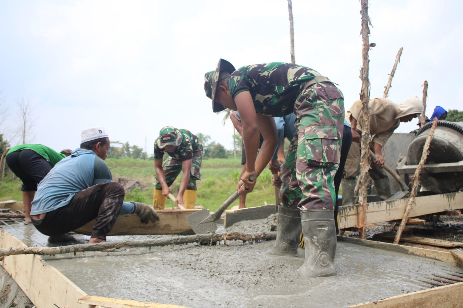 Tulang Bawang – Pembangunan jembatan sepanjang lima meter dan lebar dua meter yang menjadi salah satu sasaran fisik TNI Manunggal Membangun Desa (TMMD) ke-125 Kodim 0426/Tulang Bawang terus menunjukkan progres. Setelah melalui tahap pemasangan besi, pekerjaan kini berlanjut ke proses pengecoran.