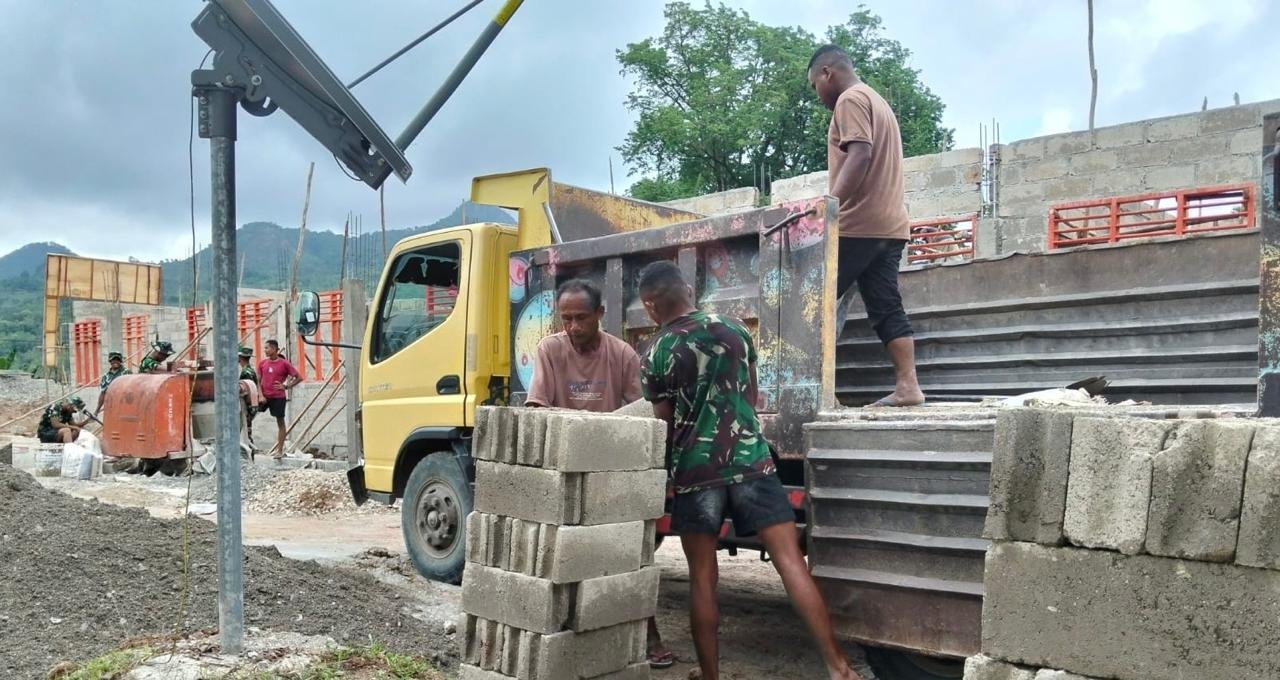 Bahan-bahan seperti sak semen, besi konstruksi, dan batako yang tersusun rapi menunjukkan kesiapan untuk memasuki tahap berikutnya dalam proyek ini. Keterlibatan aktif anggota Satgas dalam proses bongkar muat bersamaan dengan masyarakat setempat mencerminkan komitmen dan semangat kebersamaan yang tinggi.