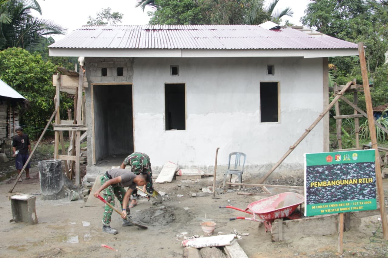Tolitoli – Untuk mempercepat penyelesaian proyek fisik, Satgas TMMD ke-127 dari Kodim 1305/Buol Tolitoli fokus pada pembangunan Rumah Tinggal Layak Huni (RTLH) di Dusun Ogomolobu, Desa Oyom, Kecamatan Lampasio, Kabupaten Tolitoli, pada Minggu (22/2/2026). Pengerjaan saat ini menekankan pada penguatan struktur bangunan serta perapian bagian dalam rumah, dengan harapan agar hasil pembangunan berkualitas tinggi dan tahan lama.