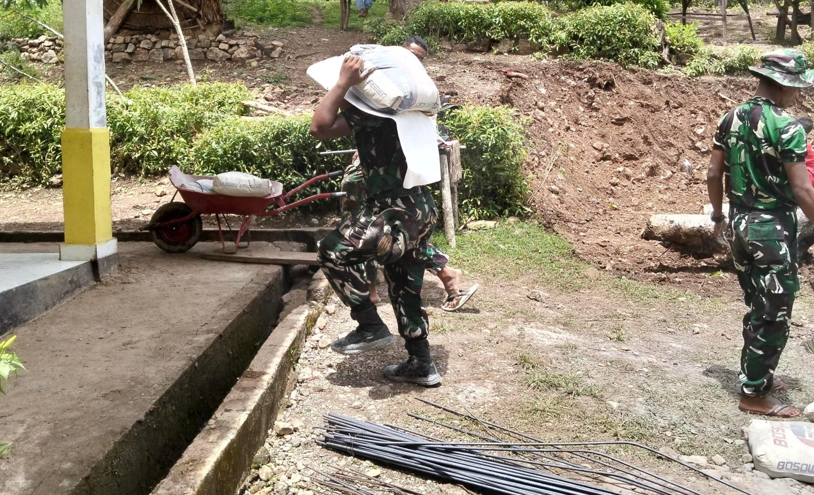Dalam proses tersebut, anggota prajurit bekerja sama dengan masyarakat setempat dalam kondisi medan perbukitan yang menantang, melakukan berbagai aktivitas seperti menurunkan semen, mengangkat besi, dan menyusun batako dengan penuh dedikasi.