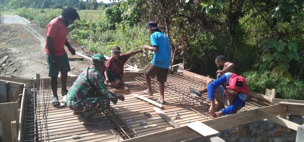 Dengan penuh semangat dan tanpa ragu, Babinsa bersama warga saling bahu-membahu mengangkat bahan material dan mengerjakan pengecoran agar jembatan penghubung antar-kampung ini segera bisa digunakan oleh masyarakat untuk menunjang aktivitas sehari-hari.