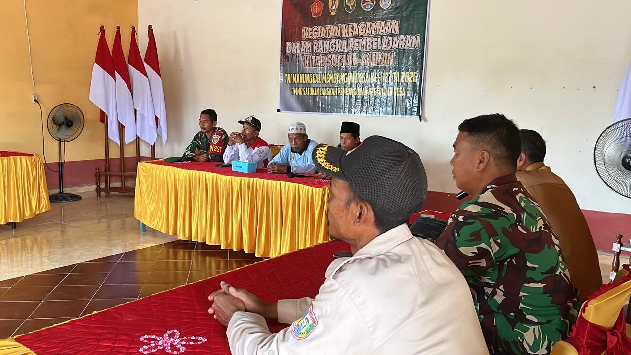Banyuasin – Dalam rangka pelaksanaan program TNI Manunggal Membangun Desa (TMMD) ke-127, anggota Satuan Tugas (Satgas) dari Kodim 0430/BA bersama masyarakat Desa Wonosari, Kecamatan Pulau Rimau, mengikuti kegiatan penyuluhan agama yang menghadirkan narasumber dari Bintalrem 044/Gapo.