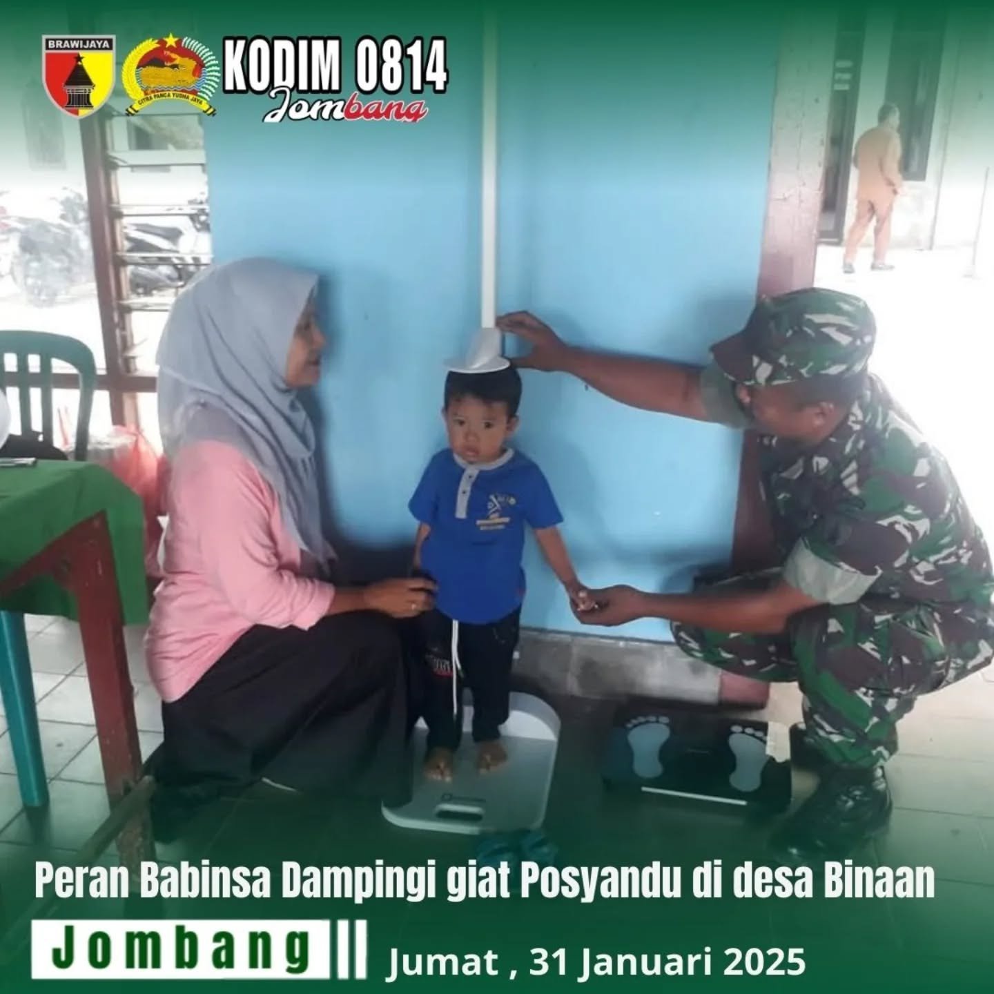 Jombang – Serda Anas Fauzi, Babinsa Koramil 0814-02/diwek Kodim 0814/Jombang, turut berperan aktif dalam kegiatan posyandu yang berlangsung di Posyandu , dsn blimbing, Desa kwaron, Kecamatan diwek, Kabupaten Jombang. Kegiatan yang diadakan tersebut meliputi penimbangan berat badan, pengukuran tinggi badan, serta pemeriksaan ibu hamil dan balita.Jumat (31/01/2025).