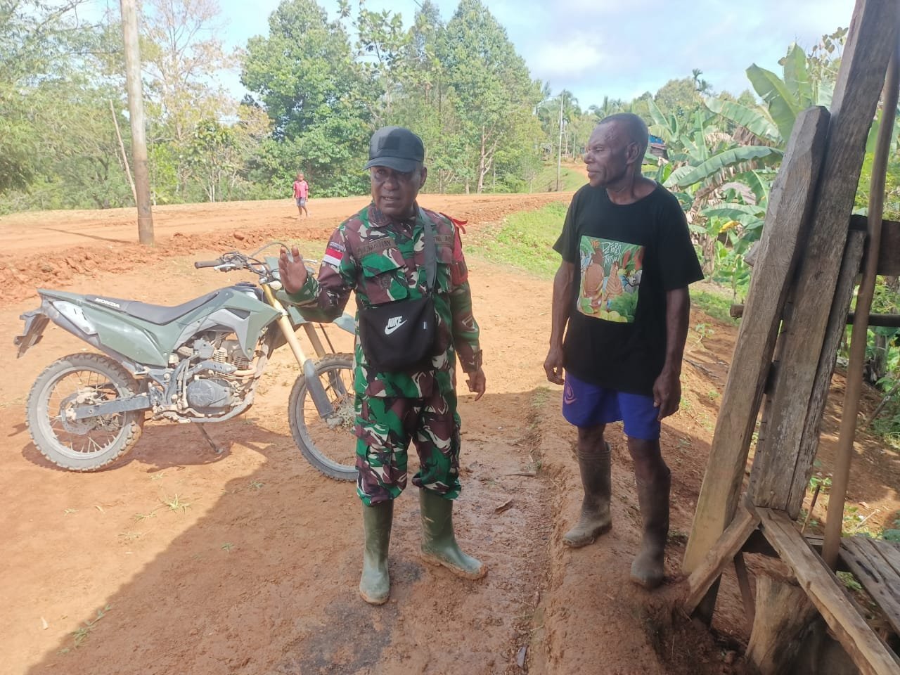 Komandan SSK TMMD ke-126 Kodim 1711/BVD, Kapten Inf Melianus Momay, memanfaatkan waktu istirahatnya untuk berkunjung ke rumah salah satu warga di RT 001 Kampung Waropko, Distrik Waropko, Kabupaten Boven Digoel, pada Jumat (10/10/2025).